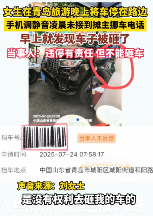 “严查到底!”山东,一女子来青岛旅游,晚上将车子停放在了路边,不料,该路段是早市经营点,她的车占用了摊主的位置。凌晨4点到6点,摊主一直给女子打电话挪车,但女子手机开了静音没有听到,等女子去开车时就看到车子被人砸了!警方调取监控发现那个位置是盲区,什么都没有拍到。 - 2025年7月24日清晨七点半,青岛柏油路上满地碎玻璃,像是有人发火后的残留证据,刘女士刚推开民宿门准备开车走,眼前的景象让她整个人都愣住了,副驾驶车窗被砸出大窟窿,蛛网般裂纹疯长,车身还划了几道深痕,仿佛被硬物狠狠抽过一样,第一反应是遇贼,赶紧检查车里财物,却发现包和贵重物品都安然无恙, 她拿起手机一看,屏幕上数百个未接电话密密麻麻集中在凌晨四到六点,电话轰炸感让她头皮发麻,这一切仿佛预示着一场错位的风暴正在上演,原来前一晚她随意停车根本没注意到凌晨三点后的路段早市规则,平时看似普通的空地,在凌晨三点后变成了另一片江湖,每一块地盘都有人看护,凌晨四点就是开市生死线,摊主必须提前赶来占位,而她的车正好钉在热门摊位的"命门"上,触发了冲突。 失控的摊主为什么会砸车?原因其实简单又无奈,他从凌晨四点开始拨打电话,每一次都消耗着耐心和当天生计,电话那头刘女士的手机处于静音状态,根本没应答,而摊主眼睁睁看着人流涌入,自己的地盘被一块钢铁占据,经济压力瞬间堆积成爆炸点,早市摊位不能随便挪动,备好的食材卖不出去就是纯亏损, 第五次拨打无果后,摊主终于情绪失控,站在车边狠狠说了一句"挡摊就活该",随后响起清脆的玻璃碎裂声,副驾驶窗应声而破,现场的混乱如同法律和生计的交锋,民警后来到场时发现车停在监控死角,左侧路口和右侧居民楼盲区都看不到,科技完全失效,调查只能靠走访和推测。 刘女士对着镜头几次哽咽,她承认自己停车有错,但仍质问:难道违停就得被砸车吗?法律上很明确,违停是违规,但私自毁财也是犯罪行为,可网络舆论并不完全站在她这边,很多评论强调,如果摊主损失一整早上的收入,却等不到一句道歉或经济赔偿,责任分配极不平等,"你并不无辜"成了评论区的高频词,现实让规则意识模糊的游客和生活压力巨大的底层劳作者在这片空间里正面碰撞,文明的监控无法覆盖盲区,暴力就这样在清晨的沉默里破窗而出。 目前,受损的轿车已经送去维修,刘女士坚持保留法律追责权利,警方调查仍在走访中继续,这场冲突始于2025年盛夏,到现在依旧没有绝对的正义结局,这块碎玻璃其实折射了两种生存逻辑的冲突,一边是抱着侥幸心理、以为第二天就离开的游客,一边是被生活逼到墙角、视财路如命的摊主,当规则和生计发生碰撞,法律和秩序未能及时介入,暴力就在沉默的清晨里,硬生生破窗而出,现实残酷又真实,提醒每个人理解底层生活的压力与规则的边界。