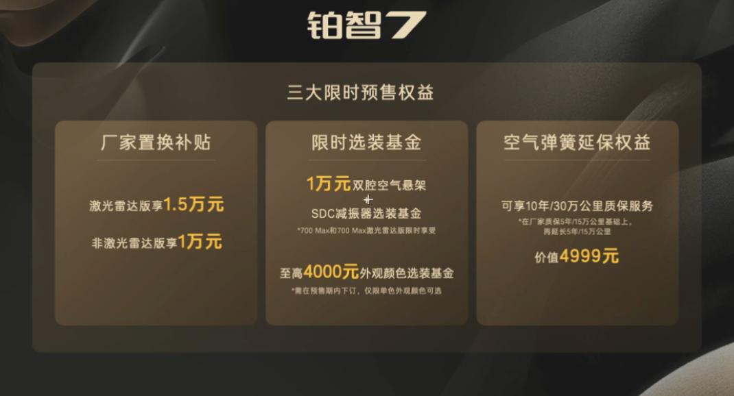15.68-20.98万的丰田铂智7比BBA都要香啊 全新丰田铂智7 尺寸:5130*1965*1506mm,轴距:3020mm(D级轿车) 驱动形式:纯电 电机功率:200kW 纯电续航:600-710km 电池容量:88.13kWh 底盘:前双叉臂后多连杆+双腔空悬+SDC 轮毂尺寸:20/21寸 智能辅助:Momenta R6 智驾硬件:激光雷达*1/12*超声波雷达/13*摄像头 智能座舱:鸿蒙座舱5 屏幕:8.8仪表屏+15.6中控屏 行李箱容积:410L 外观颜色:红/白/灰/金/翠/黑/银 内饰颜色:灰/紫/棕 座舱:内饰全软皮包覆/前后排车窗双层夹胶玻璃/无边框车门/半隐藏门把手/超长扶手 座椅:真皮Nappa/副驾零重力座椅+小腿托/副驾后排小桌板/全车加热+通风+按摩/一键小息 其他:二段式遮阳帘/冷暖冰箱/香薰系统/雅马哈23扬声器/小米车载硬件(屏幕) 15.68万 600Pro 17.08万 600激光雷达版 17.48万 700MAX 18.98万 700MAX激光雷达版 20.98万 710Ultra激光雷达版 低配是600续航的版本,价格激光雷达给4000。次低配是17.48万的700续航版本,总体差距在8000块,因此最低配性价比不高,必须从17.48万的次低配开始选。要是不要激光雷达,其实700Max的版本足够了,需要激光雷达才18.98万,顶配按需选购即可。丰田这波的诚意绝对是足的,比起其他D级车,可以说性价比十足了。教授看到这个价格,只有一个想法,就是别家的合资C级车怎么卖?【来自懂车帝车友圈】