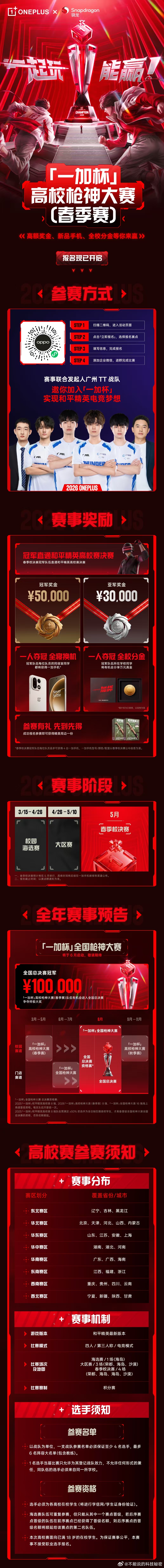 自2025年3月,由一加手机发起的「一加杯」启动首届赛事,通过覆盖全国200余城市的276所高校,吸引4.5万人次报名,创下移动电竞领域高校覆盖率纪录,并获得全国高校电竞爱好者的广泛关注。