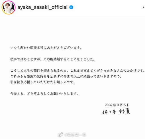 佐佐木彩夏结婚佐佐木彩夏宣布结婚 据日媒,女性偶像组合“桃色幸运草z”成员佐佐木彩夏今日宣布了结婚喜讯。
