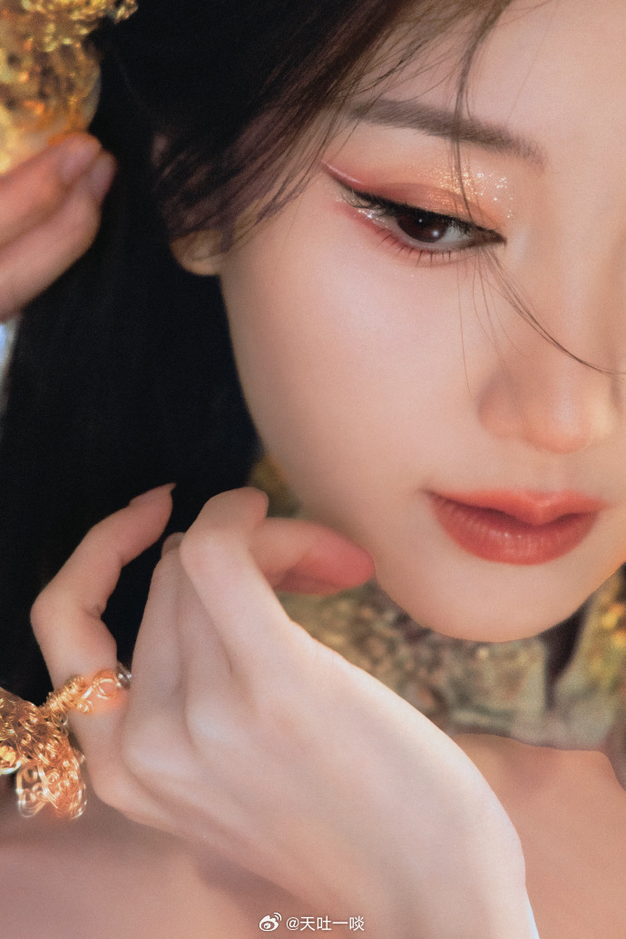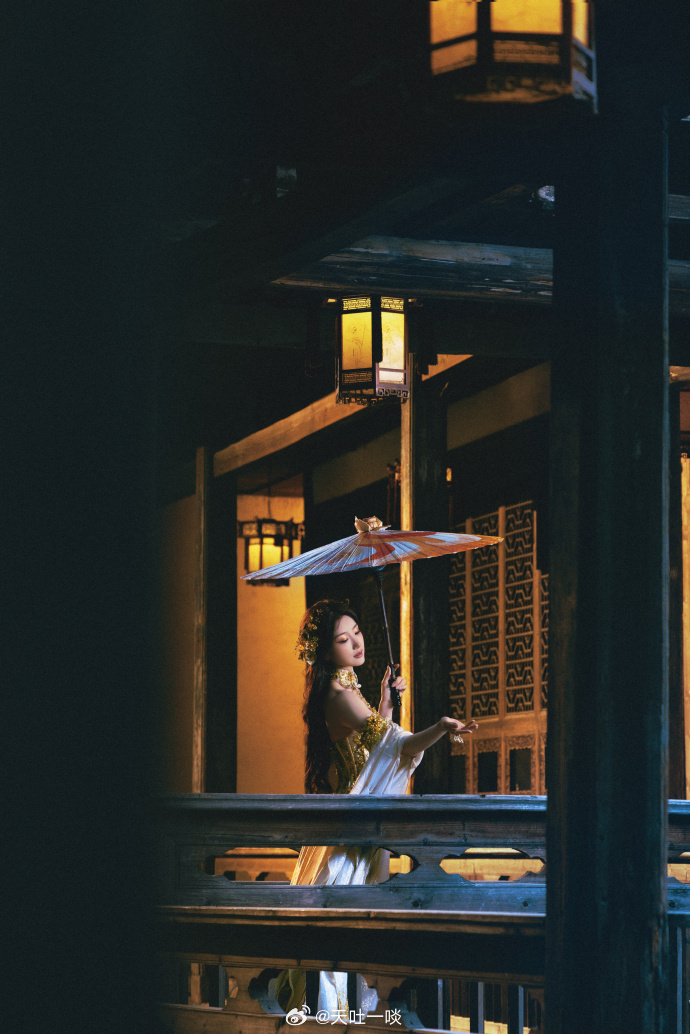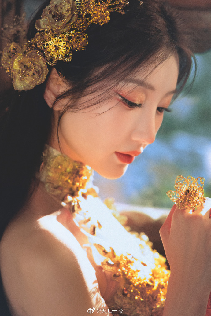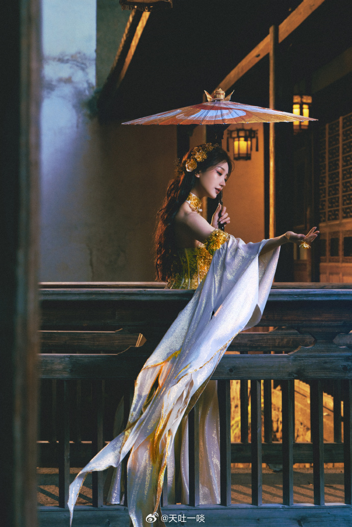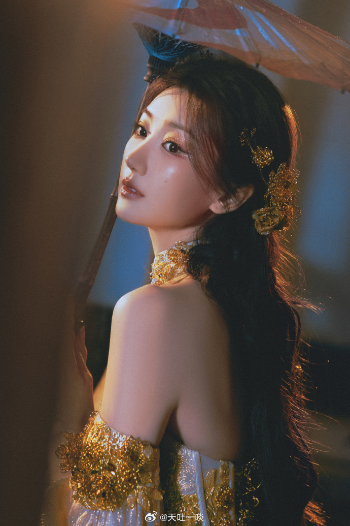 鎏金刺绣纱裙、持伞起舞灵动贵气——毛晓彤。每日明星美图分享