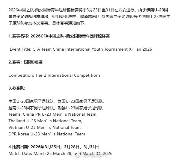 伊朗U23国足退赛目前状况也没办法参赛啊。唉,可以理解。因伊朗U23退出此项赛事,组委会紧急邀请了越南U23替代伊朗,反应也够快。伊朗u23退出西安足球锦标赛中国足球