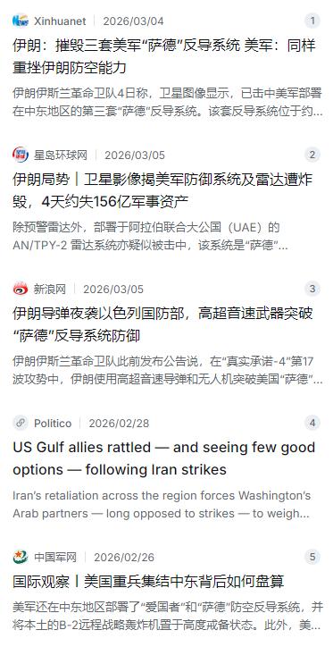 伊朗革命卫队再次取得一个重大战果,特朗普估计要气急败坏了!3月4日,伊朗伊斯兰革命卫队称,卫星图像显示,已击中美军部署在中东地区的第三套“萨德”反导系统。这是美军部署在约旦穆瓦法克·萨尔蒂基地的“萨德”,而此前伊朗导弹已摧毁位于阿联酋的两套“萨德”。 麻烦看官老爷们右上角点击一下“关注”,既方便您进行讨论和分享,又能给您带来不一样的参与感,感谢您的支持! 最近这几天的中东局势,那真是比好莱坞大片还刺激。就在3月4号,伊朗伊斯兰革命卫队又跳出来放了个“大卫星”,说他们根据卫星图像确认,把美军部署在约旦的一套“萨德”反导系统给端了。这可不是闹着玩的,算上之前在阿联酋被打掉的两套,这已经是美军在中东损失的第3套“萨德”了。估计这会儿特朗普要是看到这消息,手里的可乐都得气洒了,毕竟这玩意儿一套就得十几亿美金,还是那种有钱都难买到的“尖货”。 要说伊朗这次是怎么做到的,那可真得好好唠唠。他们现在学精了,玩起了“高低搭配”的战术。先用那种便宜得跟大白菜似的无人机飞过去,当诱饵去消耗“萨德”的拦截弹,顺便把对方的雷达给晃晕。等“萨德”那边打得差不多了,雷达也盯不过来了,真正的杀招——高超音速导弹就上场了。这玩意儿飞得快还能拐弯,直接冲着“萨德”最金贵的AN/TPY-2雷达去,一发入魂。没了雷达,“萨德”就是睁眼瞎,再牛的系统也成了废铁,这波操作简直就是战场上的“降维打击” 。 这么一来,美国在中东的盟友圈,尤其是阿联酋、约旦这些国家,心里肯定在打鼓。以前花大价钱买“萨德”,不就是图个心安,觉得美军能罩着自己吗?现在可好,号称全球最强的反导系统,被伊朗当烟花一样连着点了三根,这安全承诺瞬间就变成了空头支票。这些海湾国家现在肯定在琢磨:大哥到底还行不行?以后是不是得给自己留条后路,不能把宝全押在美国身上了?这种信任危机,对美国的打击比损失几套装备还要致命 。 对美军自己来说,现在的处境也是相当尴尬,进退两难。中东这片儿的防空网已经被撕开个大口子,如果不赶紧补上“萨德”,那伊朗的导弹基本就能在这片空域“自由行”了,美军基地和以色列的安全都没法保障。但如果要从全球其他地方调货,比如从正在跟中国较劲的亚太,或者盯着俄罗斯的欧洲那边抽调,那可就中了伊朗的圈套,顾此失彼,打乱了美国的全球大棋局。这“萨德”补还是不补,成了让五角大楼头疼的难题 。 更有意思的是,美国和以色列这次还损失了不少其他的高精尖装备。除了“萨德”,卡塔尔那边价值11亿美元的“铺路爪”远程预警雷达也被打坏了,这可是美军的“千里眼”。就连在巴林的第五舰队总部,通讯设备都遭了殃。还有更冤的,据说有三架美军的F-15E战斗机,居然被自家“猪队友”的防空火力给误炸了,这找谁说理去?零零总总算下来,这短短几天,美军直接和间接的损失奔着上百亿美元就去了,简直是放血大甩卖 。 伊朗那边现在是越打越顺手,甚至放出话来,说已经摧毁了美以7套先进雷达系统,让他们在这片地区成了“瞎子”。这话虽然有点夸张,但也确实反映出一个现实:美军在中东几十年构建的立体化监控和防御网络,正面临着前所未有的挑战。伊朗用实战证明,甭管多贵的武器都有命门,只要战术对头,一样能捅破这个“金钟罩” 。 最后不得不说,这件事的影响可能才刚刚开始。以前大家都觉得美国装备天下无敌,现在这层“神话”被伊朗用导弹硬生生撕了个口子。这不仅改变了中东的军事平衡,也可能让全球其他国家开始重新评估美国武器的含金量。对于特朗普政府来说,这不仅是一次军事上的挫败,更是一次战略上的羞辱。接下来怎么接招,是咬着牙硬刚到底,还是想办法找个台阶下,全世界都在等着看这出大戏的下一集。