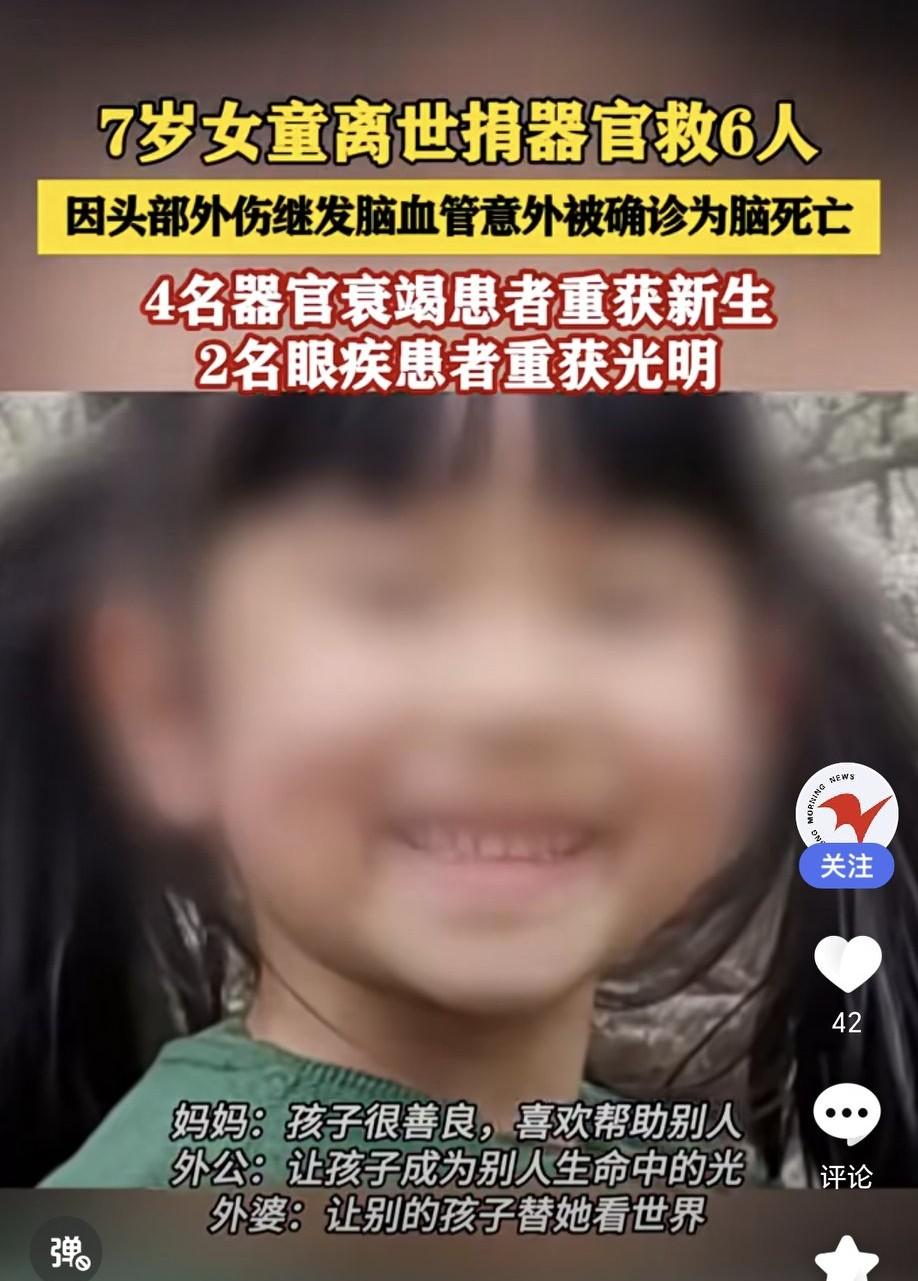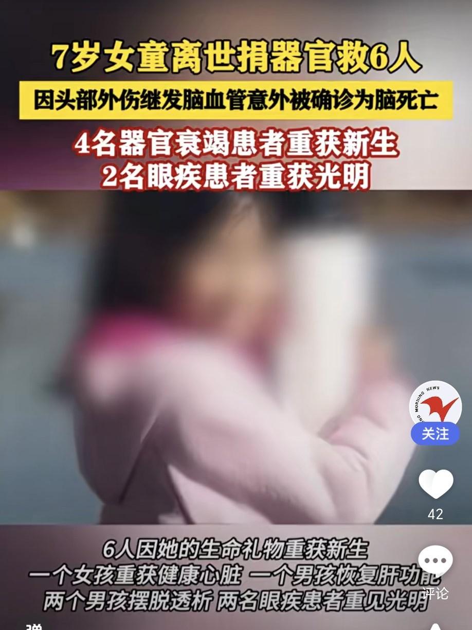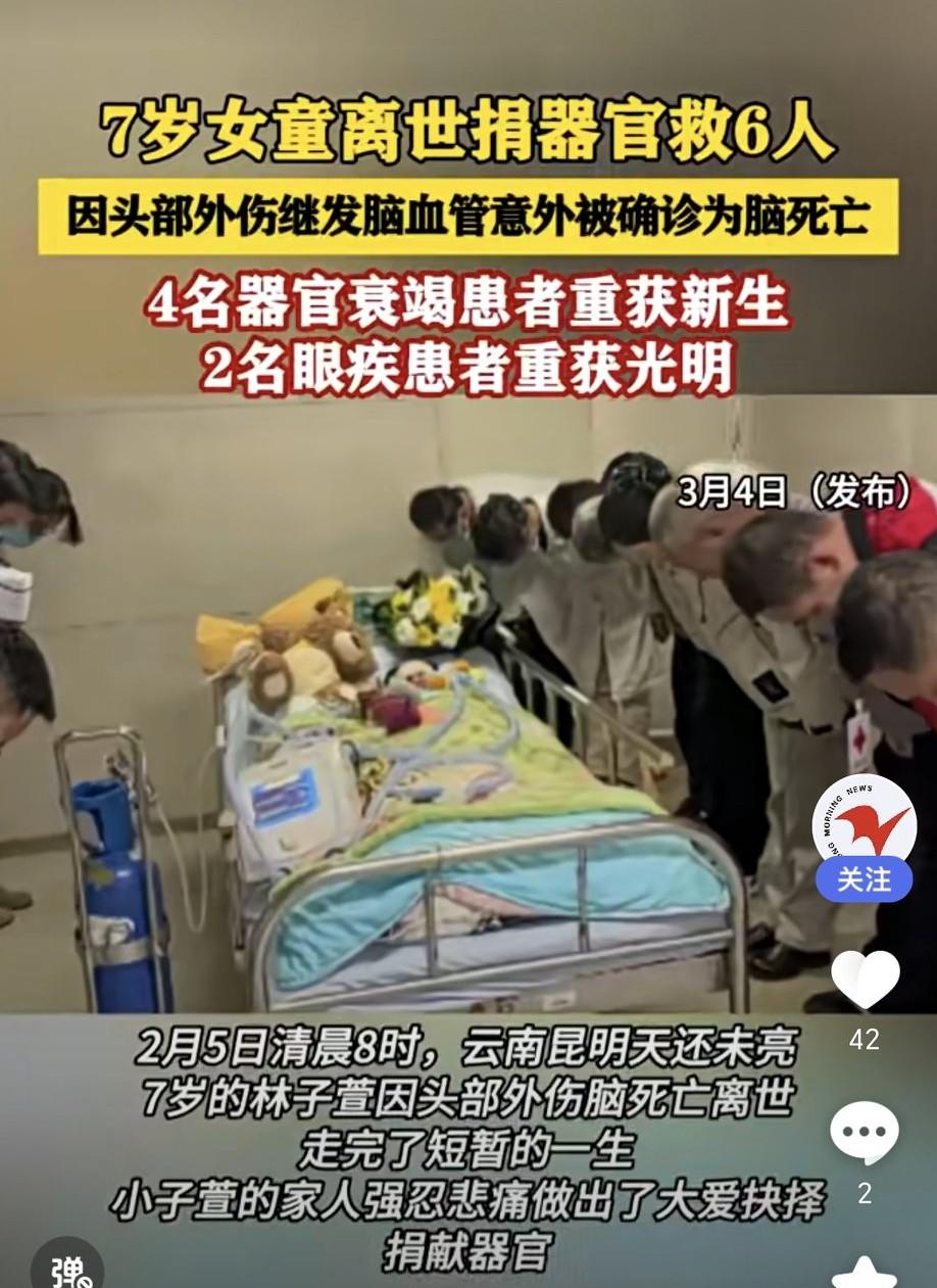 云南昆明7岁女童离世捐献器官救6人 2026年2月5日上午8点,昆明7岁女童林子萱因头部外伤继发脑血管意外被确诊脑死亡。面对这突如其来的悲剧,家人做出大爱抉择——捐献孩子器官。 这一善举让4名器官衰竭的同龄伙伴重获新生,2名眼疾患者重见光明。妈妈说孩子善良爱助人,外公希望孩子成为别人生命中的光,外婆希望别的孩子替她看世界。 小子萱的这份捐献跨越山海,让生命以另一种方式延续,她的心脏在上海女孩胸腔跳动,肝脏让昆明男孩肝功能恢复。林子萱用稚嫩生命谱写跨越生死的赞歌,她和家人的无私奉献,将个人悲伤化为他人希望。 虽生命短暂,却用器官延续了他人的希望, 致敬这位小天使!