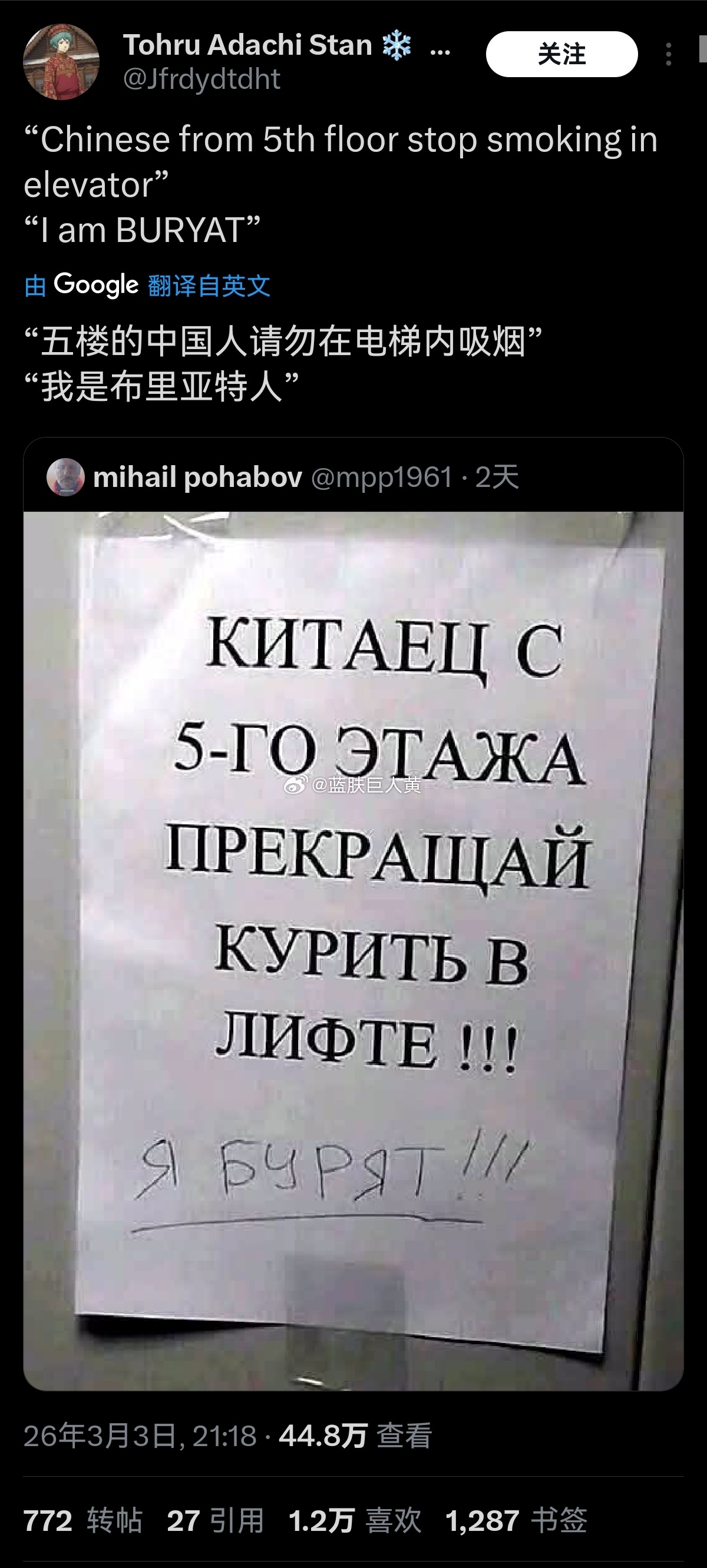 俄罗斯热帖:俄国公寓,有人在电梯里怒贴告示,要求“5楼的中国人不准在电梯间吸烟”,结果那个吸烟的是布里亚特人