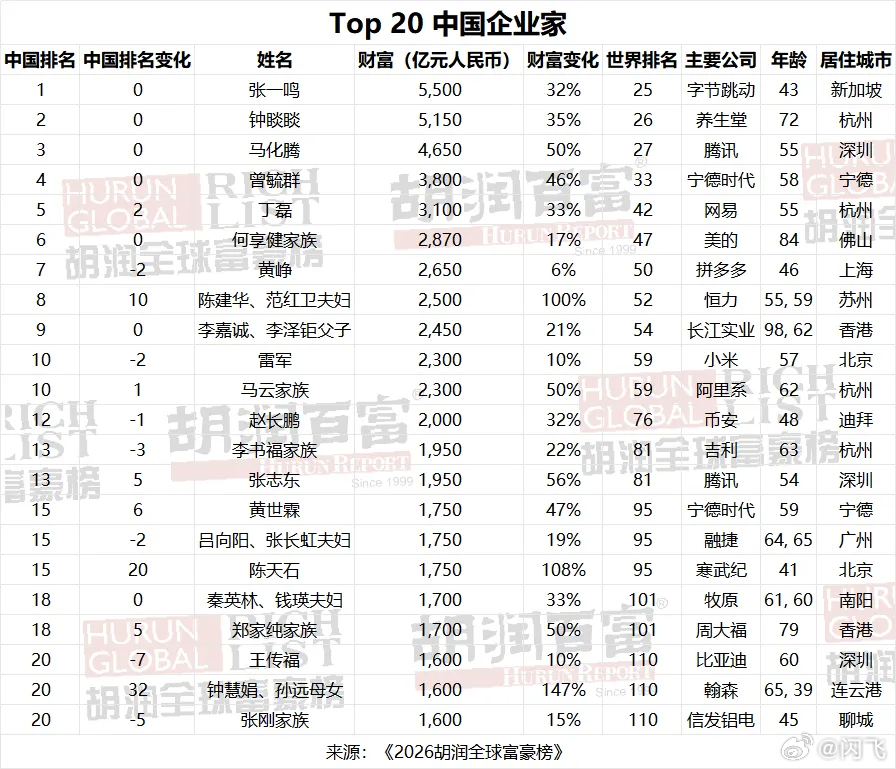 胡润发布2026全球富豪榜,其中中国首富是张一鸣,马化腾第三,丁磊第五,黄峥第七,雷军和马云并列第10位,王传福第20位。