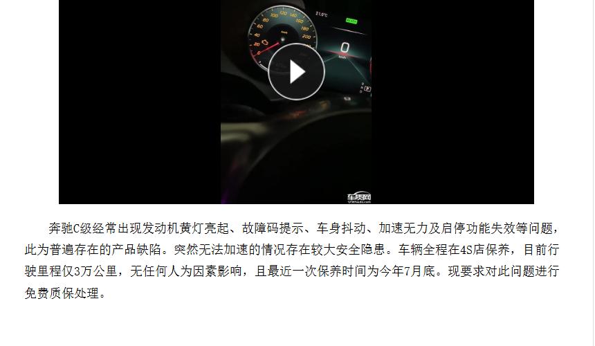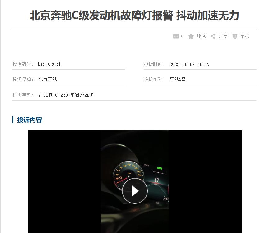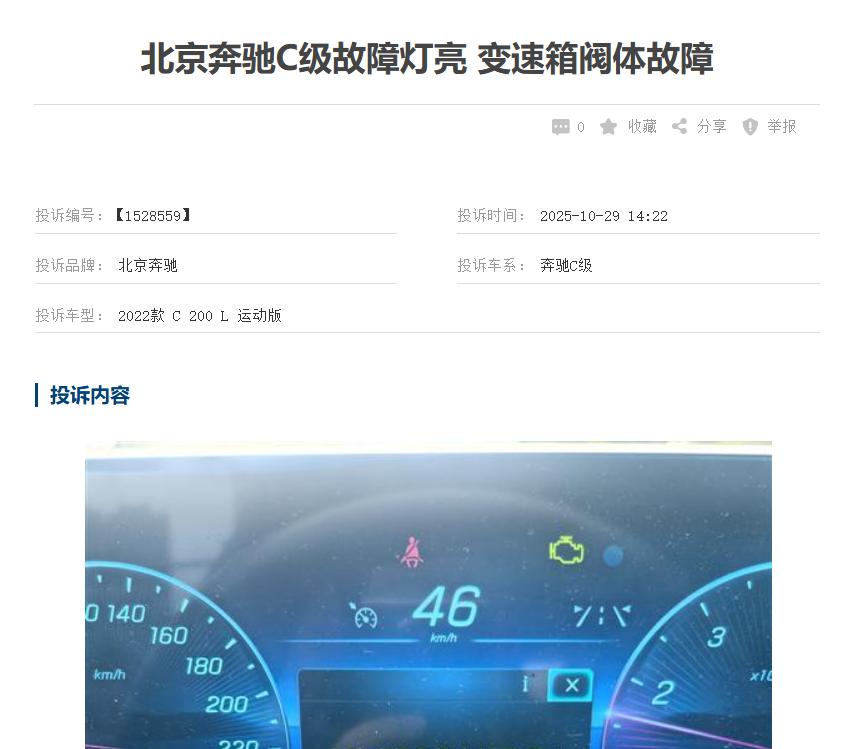【315 汽车维权】奔驰 C 级故障灯成常态,品控沦陷 + 售后推诿太寒心 25 款奔驰 C 级故障投诉扎堆,故障灯报警成高频问题,多位车主提车即遇故障:提车次日倒车影像黑屏,开 10 公里就故障灯亮、车身抖动甚至熄火,3000 公里行驶中油门踩到底无动力。核心问题源于生产环节品控缺失,48V 轻混、变速箱阀体等核心部件均有隐患。更糟的是售后治标不治本,仅清除故障码、升级软件,不更换损坏部件,问题反复出现。部分 4S 店还存在新旧件混装,对车主合理维权拖延推诿甚至态度恶劣,车主月月跑 4S 店成常态!