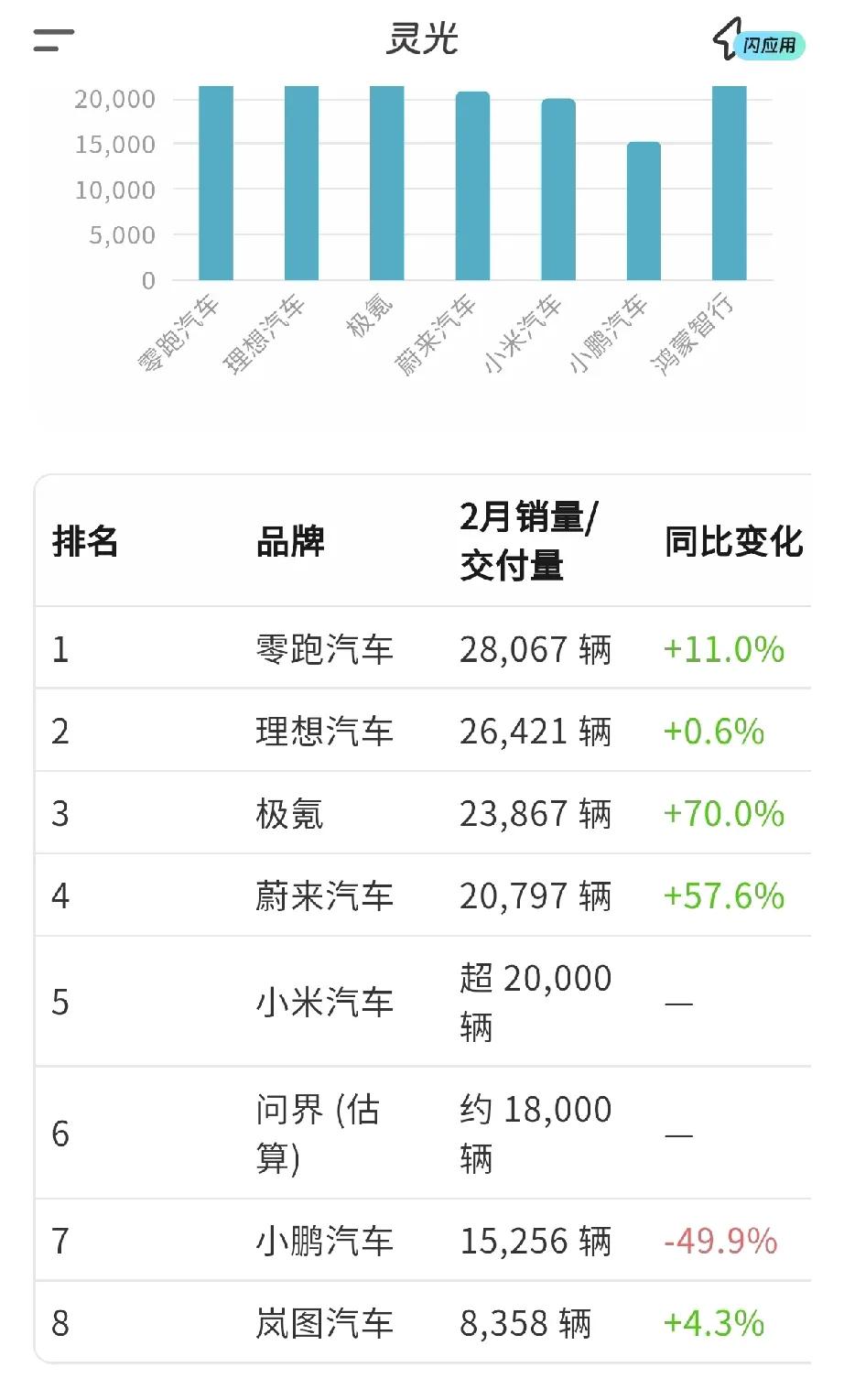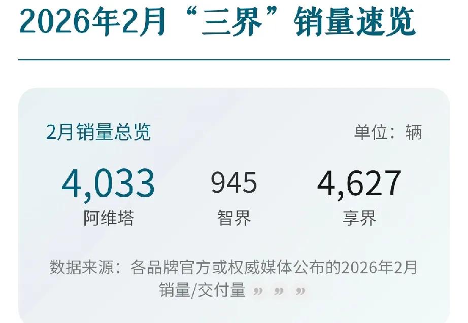 2026年2月新兴品牌(新势力)的成绩: 国企———— 岚图8358辆, 猛士1033辆, 奕派14464辆 阿维塔4033辆, 智己2017辆。 鸿蒙智行28212辆 享界4627 辆。 智界945 辆。 尚界3200左右 问界18000辆+ 尊界… 北汽蓝谷总销量为7364辆(含享界、极狐、BEIJING品牌) iCAR 5825 -1.7% 星途 4016 -53.3% 智界 945 -90.6% 民营———— 仰望232 辆。 腾势5501辆 极石1298辆 零跑28067 辆。 理想 26421 辆。 极氪23867 辆。 - 蔚来(主品牌):15,159台 - 乐道:2,981台 - 萤火虫:2,657台 小米20000 辆。 小鹏 15256 辆。 方程豹 17036 辆。 魏牌 5615台 欧拉1263台 领克27359辆,59%。 极氪23867辆,70%。