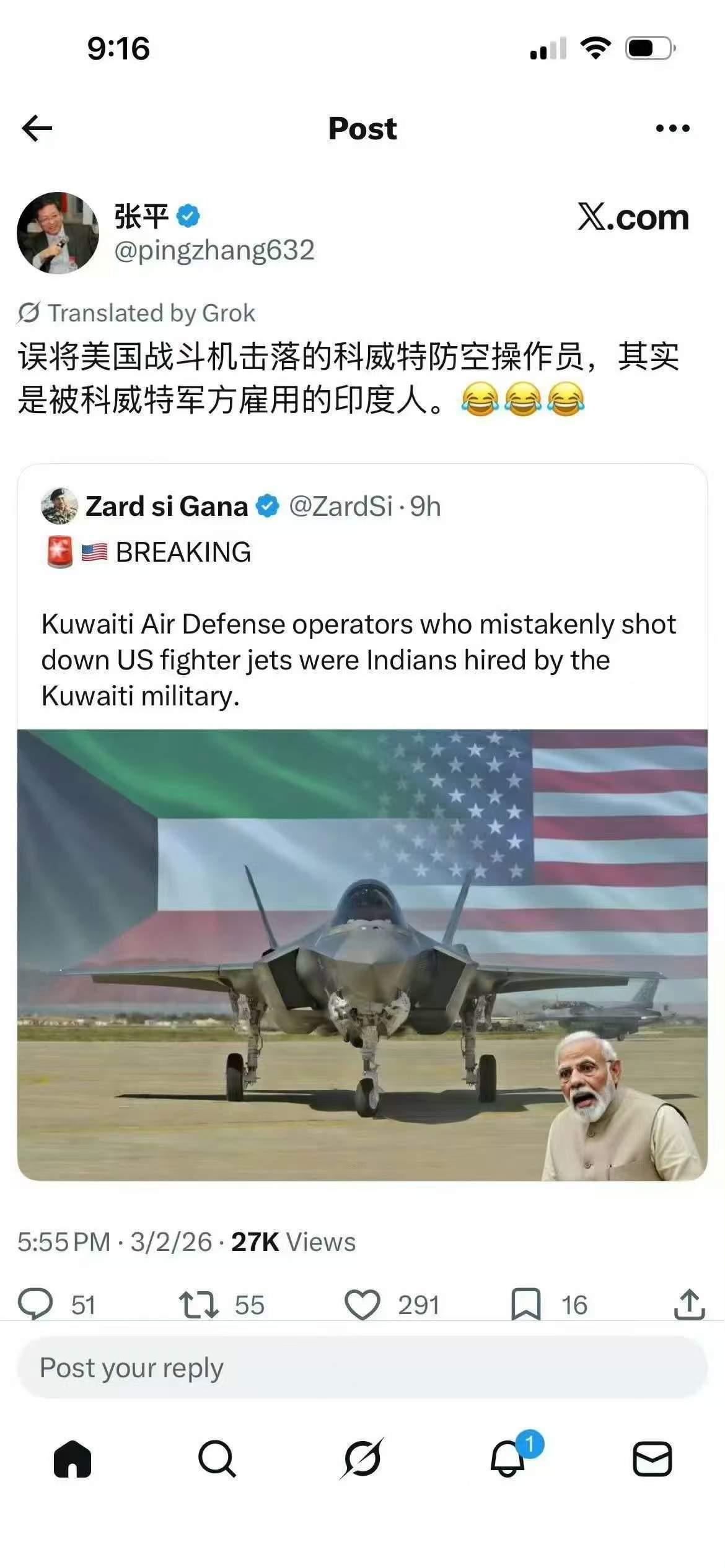 为了老美的面子,这锅阿三就背了吧! 美国飞机被伊朗击落,美国死不承认,但总得编套说辞给国人交代吧,就说是被科威特友军误射击落,但是一下误击3架,太离谱了,科威特当然不肯背锅。 但是事情总要给一套合理的解释吧,这时老美想到了阿三,天生背锅侠,此时不用更待何时? 于是美国官方的说辞来了:事后调查发现,这三架战机不是被伊朗打下来的,而是科威特的防空部队"手滑"了。更离谱的是,操作那套防空导弹的压根不是科威特人,而是从印度雇来的雇佣兵——这给整件事又添了一层荒诞色彩。