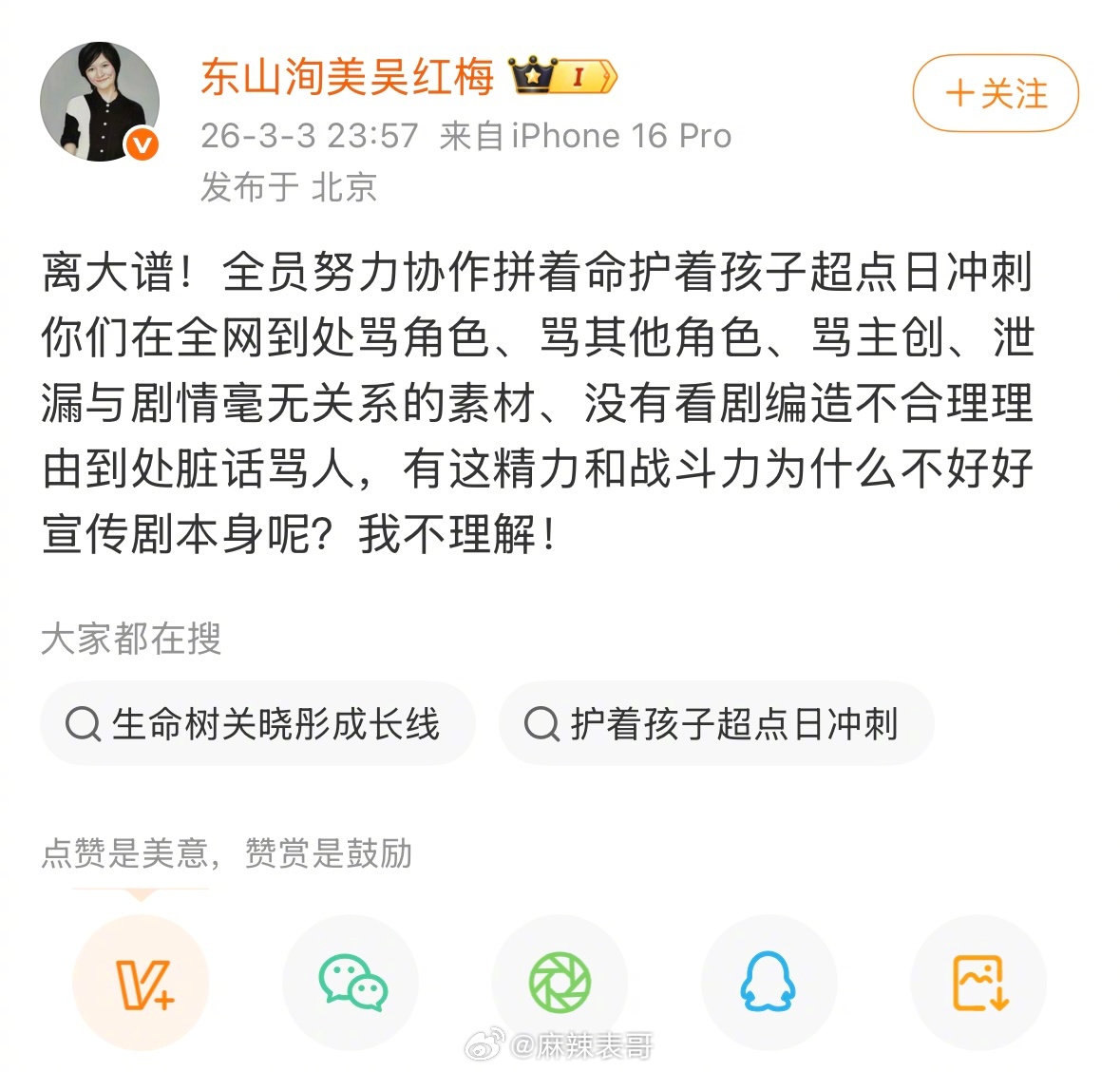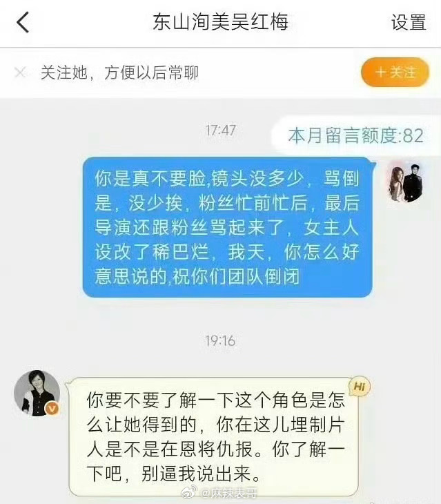 因为《岁月有情时》里关晓彤戏份少,粉丝跑去骂制片人了,制片人一一解释不行后,内涵关晓彤「了解一下这个角色是怎么让她得到的」。