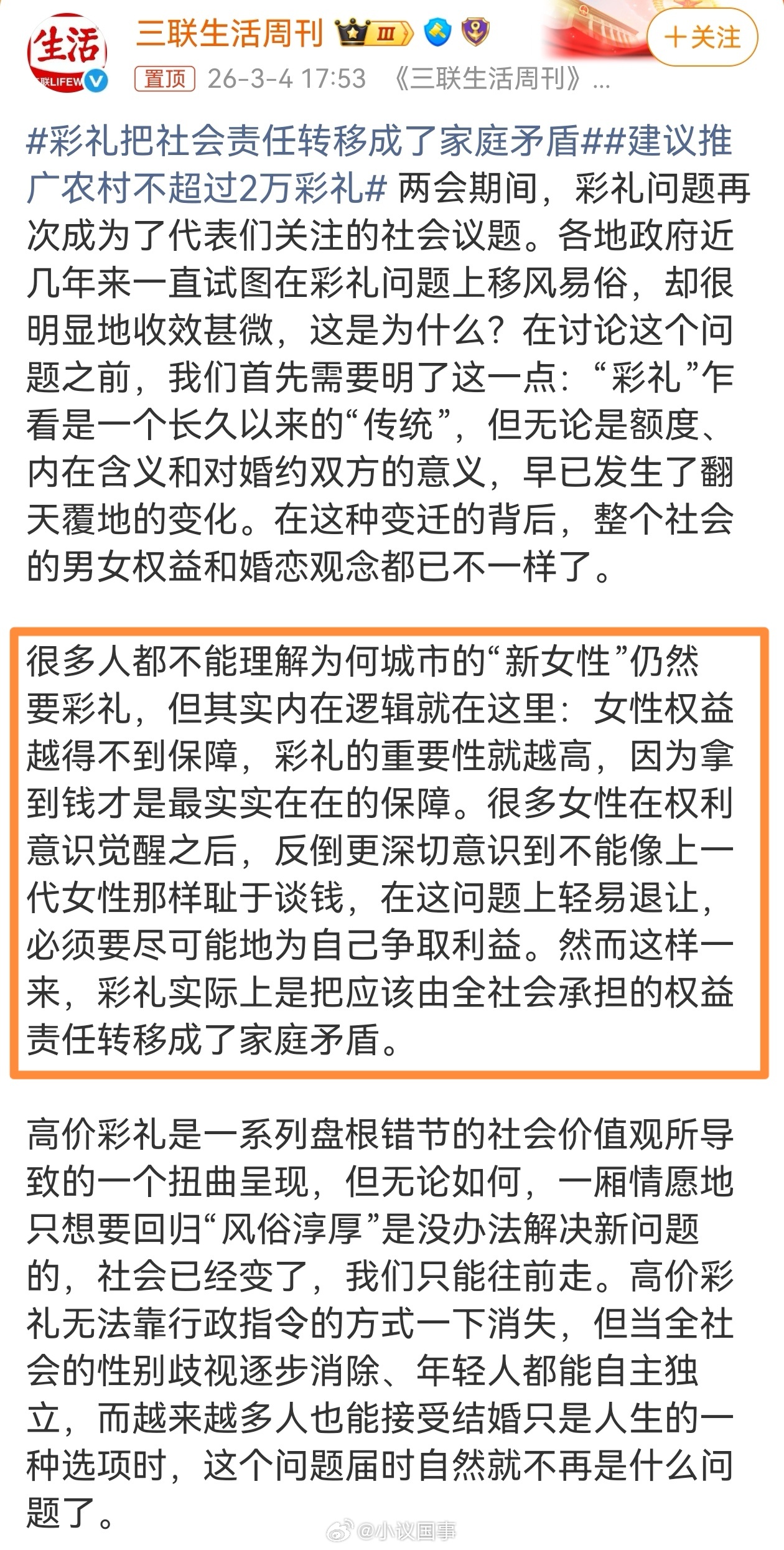 彩礼把社会责任转移成了家庭矛盾虽然说彩礼和婚恋问题复杂吧,但也不至于写的这么乱七八糟,尤其这种标题,简直就是在误导视听、制造矛盾。……