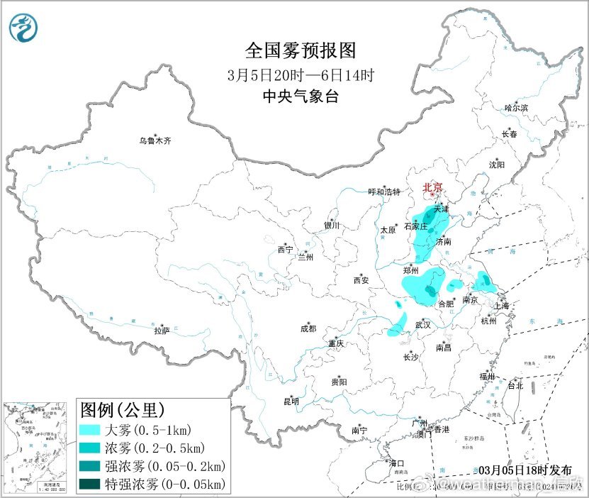 中央气象台3月5日18时发布大雾黄色预警:预计,5日夜间至6日早晨,河北中南部、河南中东部、山东西北部、江苏中部、安徽北部、湖北中部等地的部分地区有大雾天气,其中,河北南部、河南东部、江苏中部等地的部分地区有能见度不足500米的浓雾,局地有能见度不足200米的强浓雾。