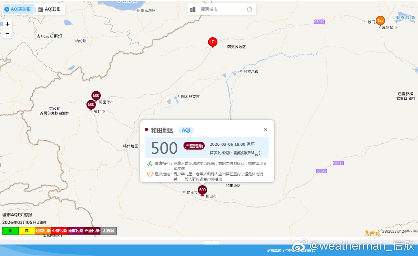 【雾 霾 沙尘】今天18时,新疆塔里木盆地里的喀什、克州、和田,因为沙尘持续影响,依然爆表,PM10超600微克/立方米。另外在山东河南湖北部分地区,还有些轻度污染,对应有霾。明天霾会继续减弱。沙尘还会滞留在塔里木盆地。此外,夜间-清晨湿度大,华北到黄淮江淮等地有大雾。