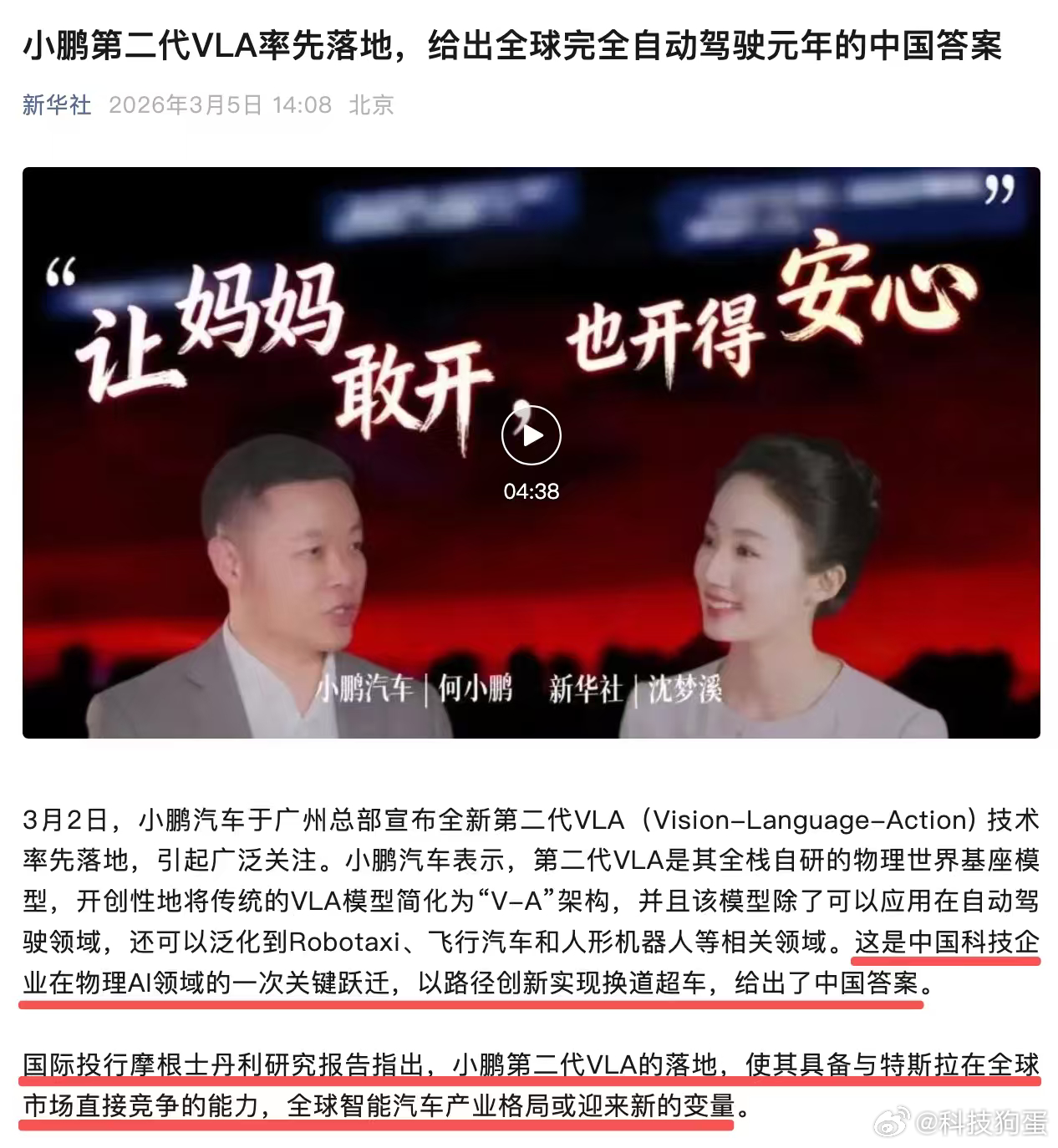 这样一来,小鹏在全球市场和特斯拉掰手腕,就不是靠喊口号了,而是真正有了差异化的底牌,很提气新华社点赞小鹏第二代VLA换道超车新华社评小鹏与特斯拉全球直接竞争