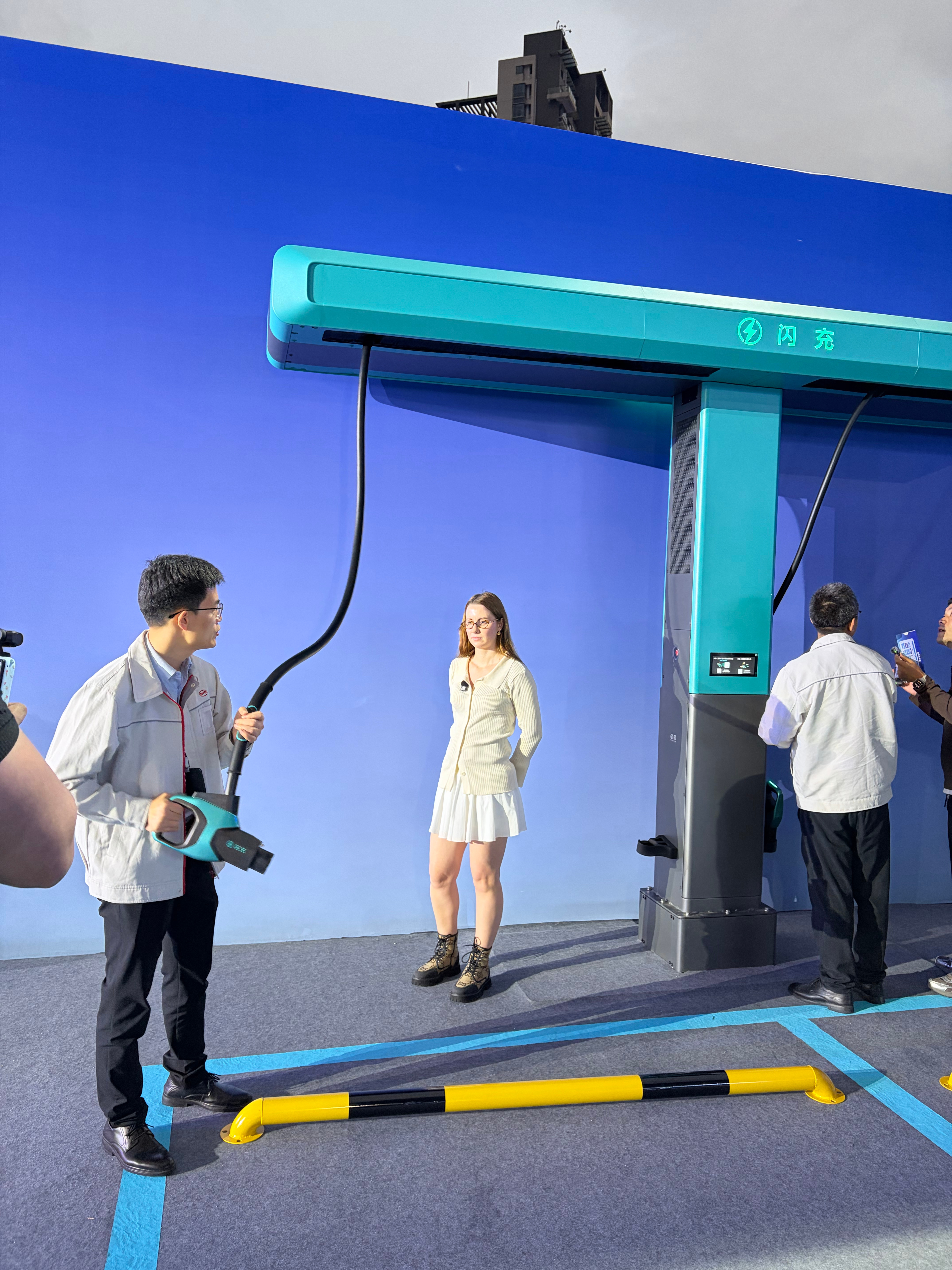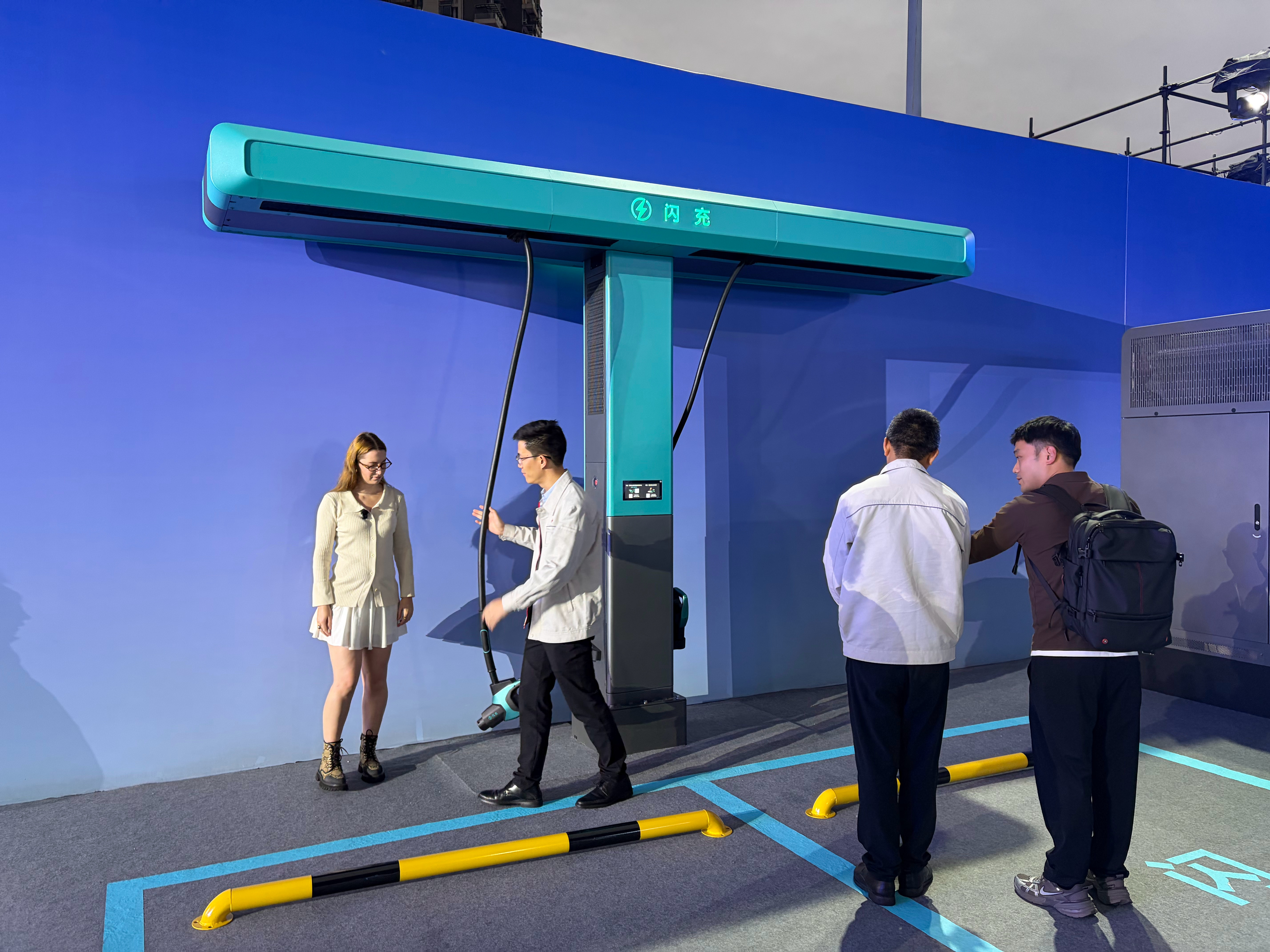 现场已经可以看到比亚迪的闪充,还是一桩双枪的布置,设计还蛮巧妙的,上面做了个滑轨,左边右边都能充,拉起来不费力,桩离地始终有几十公分的距离,确保不会掉在地上,旁边还有个疑似储能柜?充电功率肯定很炸裂,等今晚现场公布吧