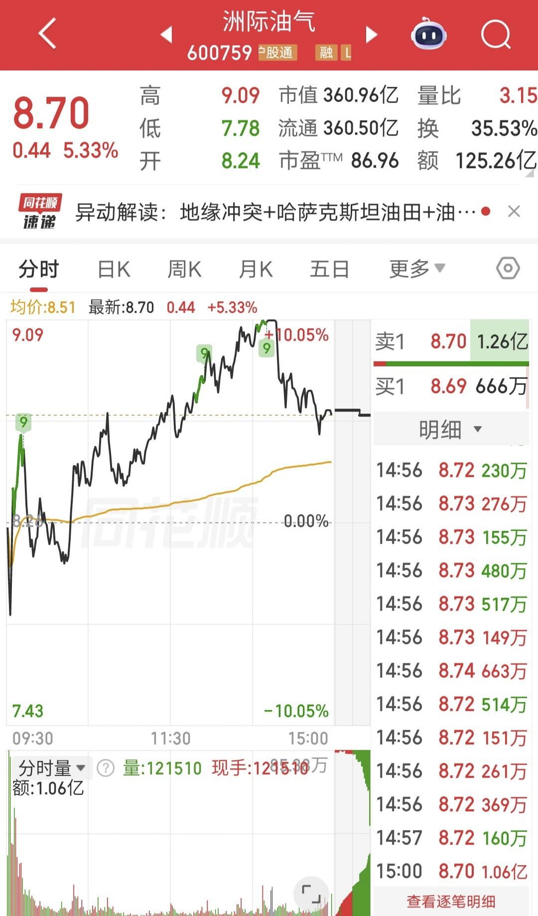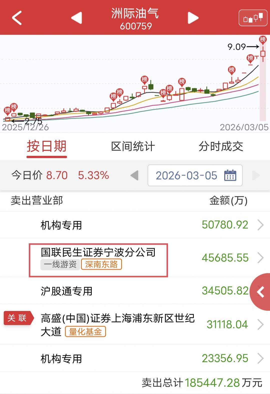 深南东路狂砸4.5个亿: 今天洲际油气非常折腾,午后冲上4板还是被爆头回落。 盘后龙虎榜显示深南东路出货4.5个亿。 现在行情太差了,4板都是坎。
