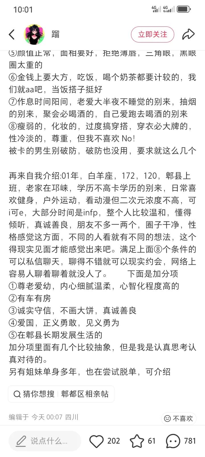 四川妹子找对象,这个颜值和要求大家觉得合理么?