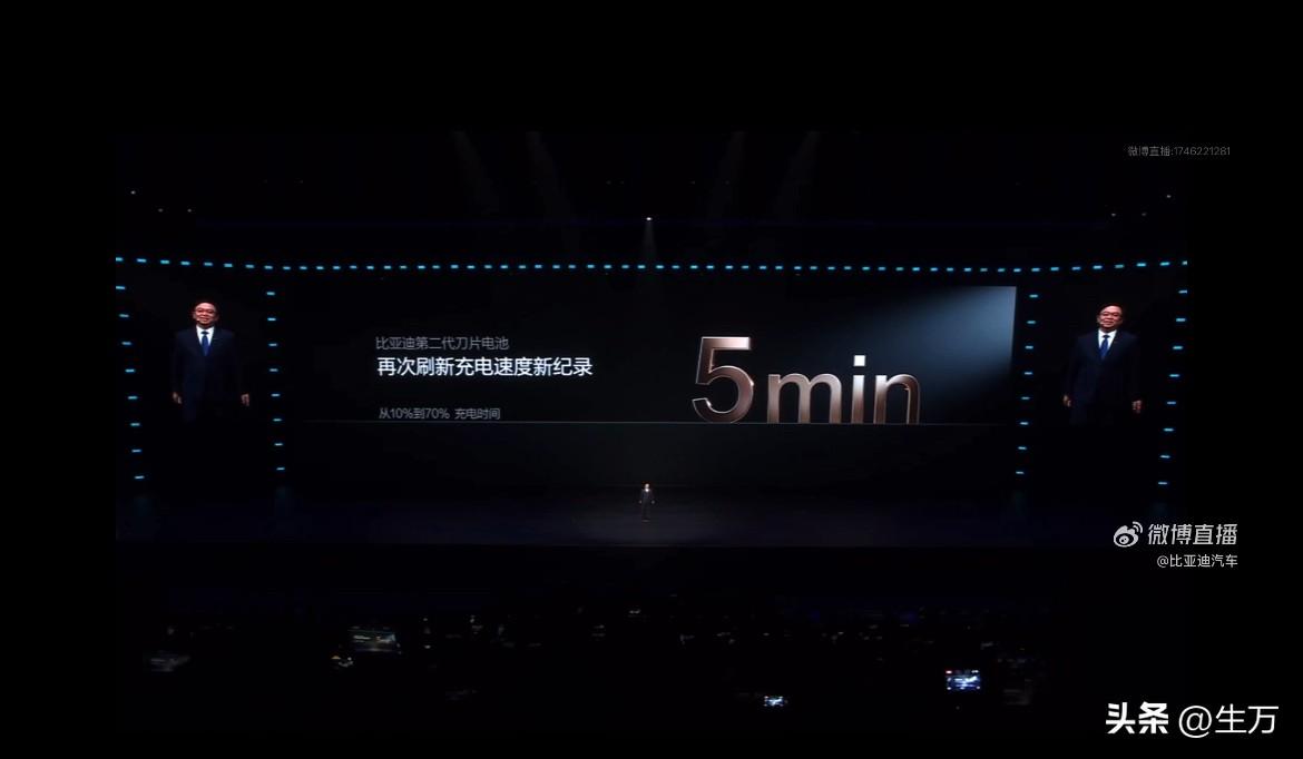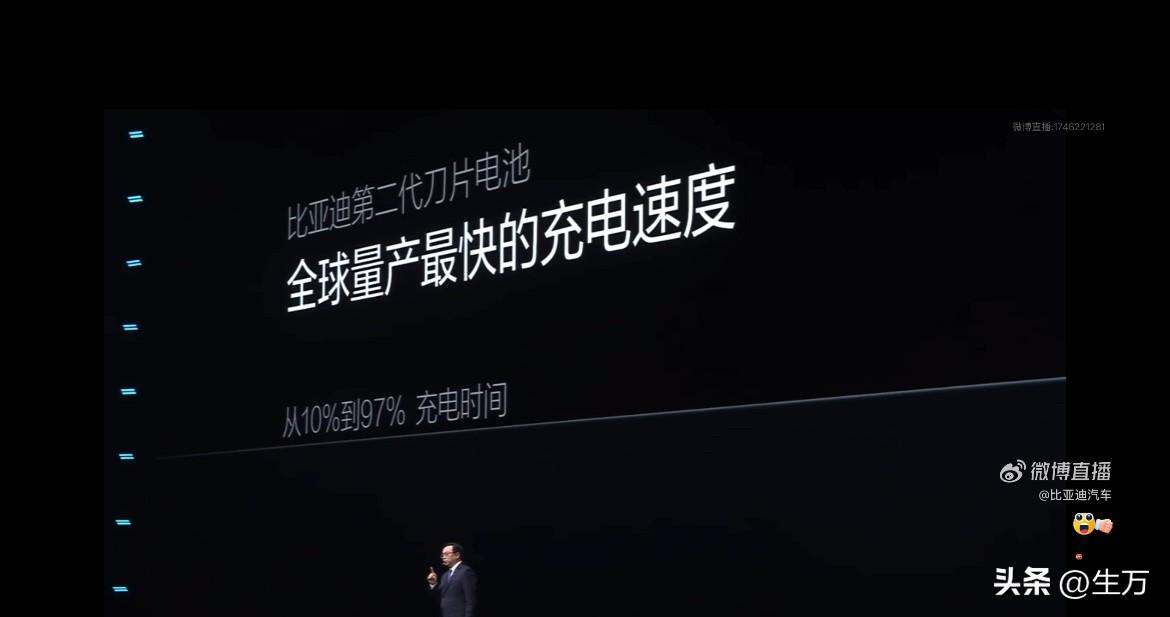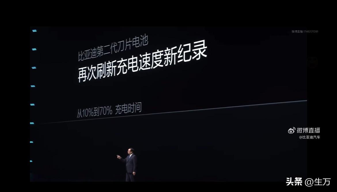 王传福:我们第二代刀片电池,从10%充到97%,只需要9分钟! 就在刚才王传福通过直播发布了他们全新的比亚迪第二代刀片电池7这个电池与之前其他电池最大区别就是充电的速度非常快,从10%充到70%只需要5分钟! 王传福说,真正考验整体技术的的其实是后面80%以后的速度,所以他们后面一共冲到97%,仅仅只要9分钟时间,他这个速度是前所未有的。 大家只需要记住这两个参数,一个是70%,以前他们只需要5分钟就能冲到另一个就是最关键的了,基本上算是充满了也只需要9分钟,所以对于同行来说应该是比较领先的一个技术了。 后面估计还有更厉害的技术,因为之前听他们的介绍好像最新的仰望七系列,就要配这个第二代的刀片电池,官方的数据是会超过1000公里,时候,我们看看具体到底是多少。