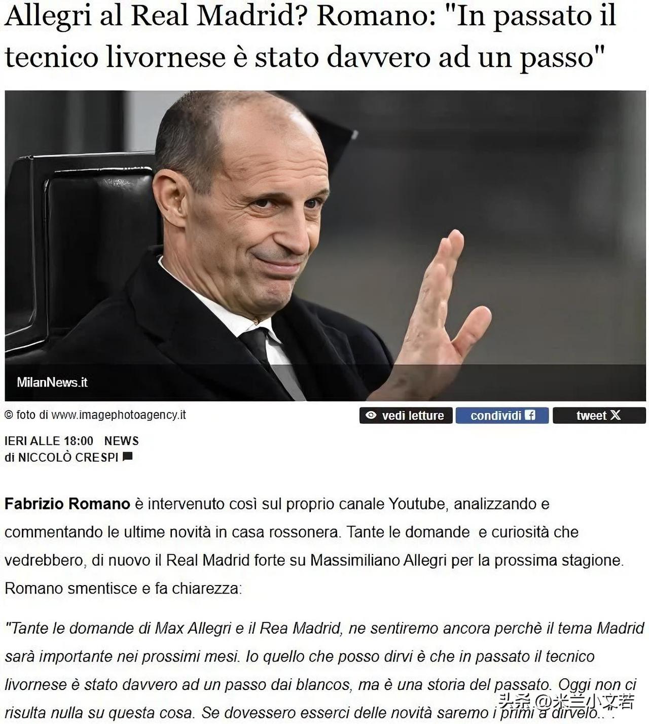 皇家马德里俱乐部之前确实邀请过阿莱格里。罗马诺消息称未来几个月,皇马的选帅话题会成为足坛焦点。我能告诉大家的是,阿莱格里确实曾距离皇马仅一步之遥,但这都已是陈年旧事。 说的是去年,去年阿莱格里确实只差一步就选择了皇家马德里俱乐部,这个事情去年貌似没有看到相关消息,当时阿隆索成为皇家马德里俱乐部教练貌似就是板上钉钉的事情,没想到同时皇家马德里也在考虑其他人。这是不是说皇家马德里对隆哥其实也心存疑虑,所以对隆哥的支持可能也不是百分之百,个人是挺看好隆哥当教练的,但他这么早去皇家马德里确实不合适。 关于今天爆出的阿莱格里成为夏季窗口皇家马德里俱乐部主教练选择之一,罗马诺称截至目前,我们没有掌握任何与此传闻相关的实质性进展,但我们会关注事情的后续发展,相信在夏季皇家马德里俱乐部确认主帅之前,皇家马德里俱乐部会与很多教练产生联系。
