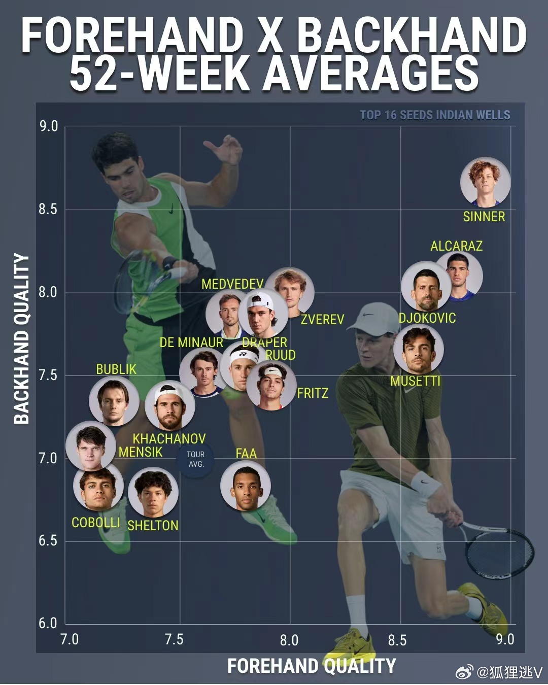 今年印第安维尔斯大师赛男单前 16 号种子选手在过去52 周内正手和反手击球质量的均值坐标排序。