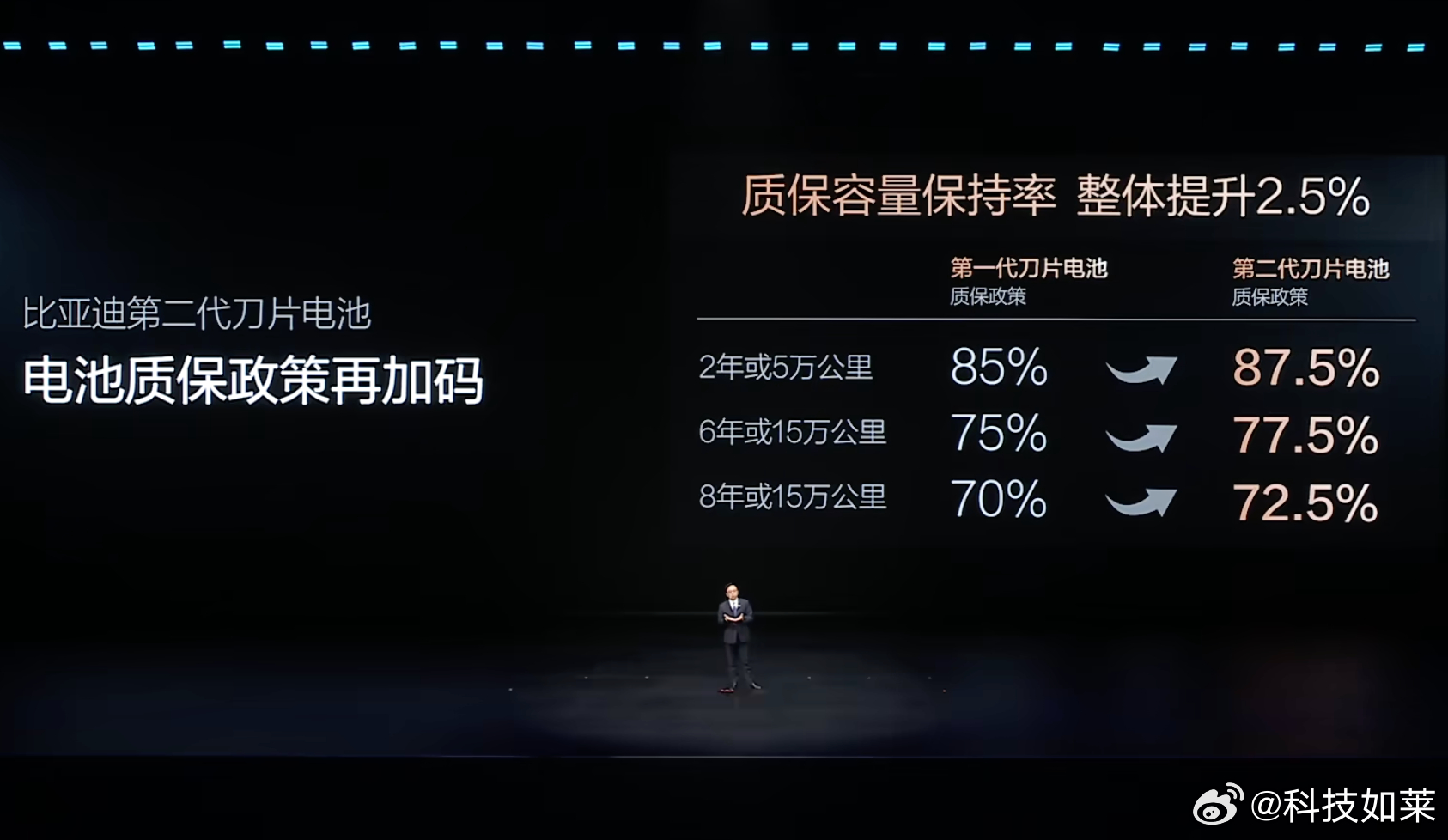 比亚迪这波质保政策确实走心了,第二代刀片电池把质保容量保持率整体提升了2.5%,2年5万公里87.5%、8年15万公里72.5%,这数据意味着电池耐用性又上了一个台阶,没有人比比亚迪更懂电池,这话我信了!比亚迪今晚发布二代刀片及闪充 比亚迪第二代刀片电池比亚迪二代刀片电池质保加码