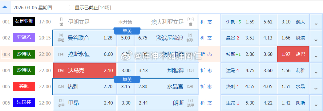 003 沙特超 03月06日 03:00科路德vs胡拜尔库迪西亚竞足参考:让负数据参考:库迪西亚-1.25比分参考:0.3 1.3