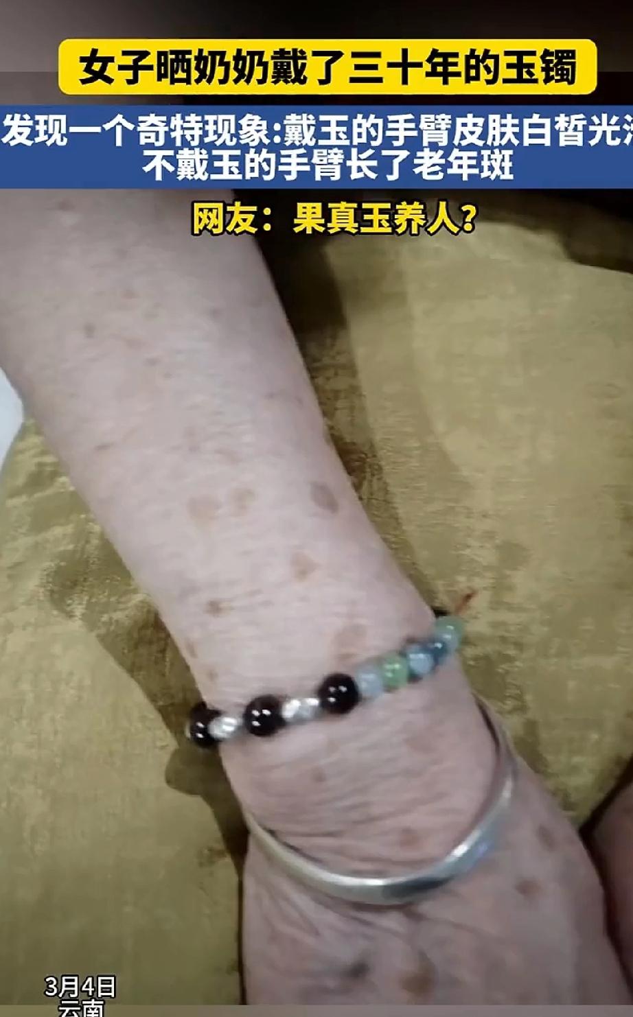 解释不清了!云南一位奶奶戴了30年的云南玉手镯,出现了神奇现象:戴手镯的那只手皮肤白皙光滑,老年斑很少;没戴的那只手老年斑明显,并且这只玉镯原本颜色偏杂,现在变得通透温润。网友直呼:果真玉养人? 三十多年前,姑娘的姑姑在云南做旅游,花了一万多块,从个熟人那儿给奶奶买了一只手镯。当时这镯子颜色还有点杂,算不上极品。 可三十多年戴下来,奇迹发生了——这镯子变得通透温润,好像被时光重新打磨过一遍。 奶奶今年八十岁,平时爱打麻将、跳舞、玩开心消消乐,还爱吃好吃的,心态像小孩,身体硬朗。 这就是咱们常听说的“人养玉,玉养人”。 专家说了,这其实是人体分泌的油脂和汗液,在体温的作用下,一点点渗进玉石微小的缝隙里,慢慢形成了“包浆”。 所以啊,不是玉真的会“长生不老”,而是奶奶的疼爱和岁月,一起滋养了这块石头。 看到这儿,有人可能会嘀咕:是不是又给卖玉的编故事呢?听听网友们的说法。 网友说“这是时光和亲情养出来的镯子” “戴的不是玉,是一辈子的安心” 这话怎么讲?你看,奶奶因为手上戴着这只贵重的镯子,怕磕着碰着,所以干重活、做家务时,自然会多一分小心,手也就被保护得好好的。 这哪是镯子养人,分明是奶奶对这只镯子的爱惜,反过来保护了自己的手。这三十年的小心呵护,既是护镯,更是护己。 更有意思的是,很多网友没盯着“玉能不能养人”这个科学问题,而是被奶奶的状态感染了。 视频里的奶奶,八十多了,还爱打麻将、跳广场舞、玩开心消消乐,声音洪亮,心态跟小孩儿似的。 你看,真正让人年轻的,或许不是手上的玉,而是那颗永远热乎、永远好奇的心。 玉镯跟着奶奶这么多年,变得越来越好看,奶奶的手也因为它被好好保护着。 镯子被“养”得温润了,是因为有主人日夜的体温和触摸;主人被“养”得年轻了,是因为心里头装着牌友、舞伴和游戏里的快乐,更装着晚辈们这份分享和牵挂。 说到底,“人养玉,玉养人”,养的不是皮肤,是那份对生活的讲究,和对自己的疼爱。 咱们点赞的,也不只是一只神奇的镯子,更是像奶奶这样,无论多少岁,都热气腾腾活着的劲儿。