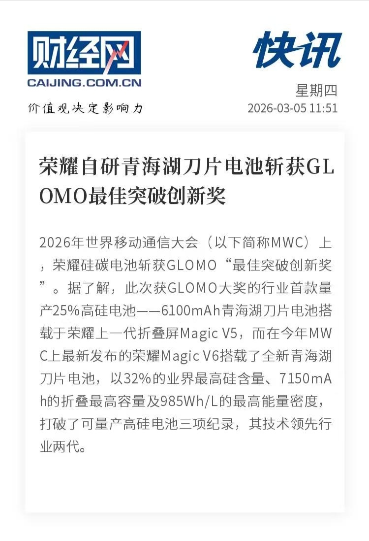 那么,今年MWC上最新发布的荣耀Magic V6,搭载全新青海湖刀片电池,以32%的业界最高硅含量、7150mAh的折叠最高容量及985Wh/L的最高能量密度,打破了可量产高硅电池三项纪录,技术领先行业两代……