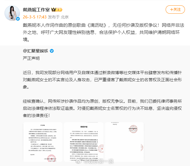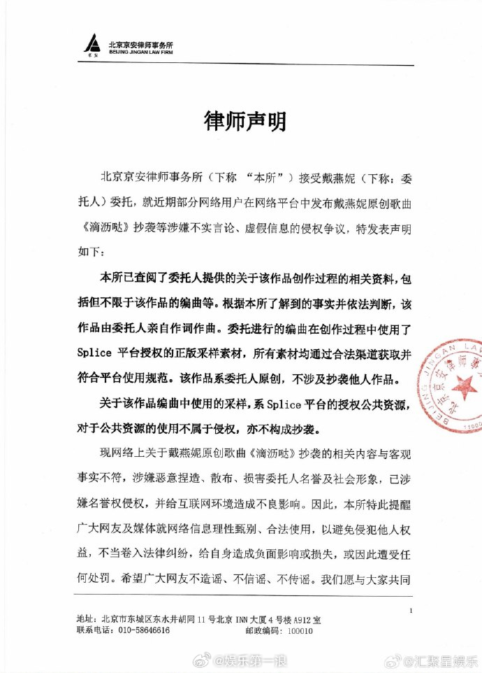 戴燕妮方否认抄袭戴燕妮方声明 3月5日,回应被指抄袭争议:“戴燕妮本人作词作曲的原创歌曲《滴沥哒》,无任何抄袭及版权争议!”戴燕妮方称版权无争议