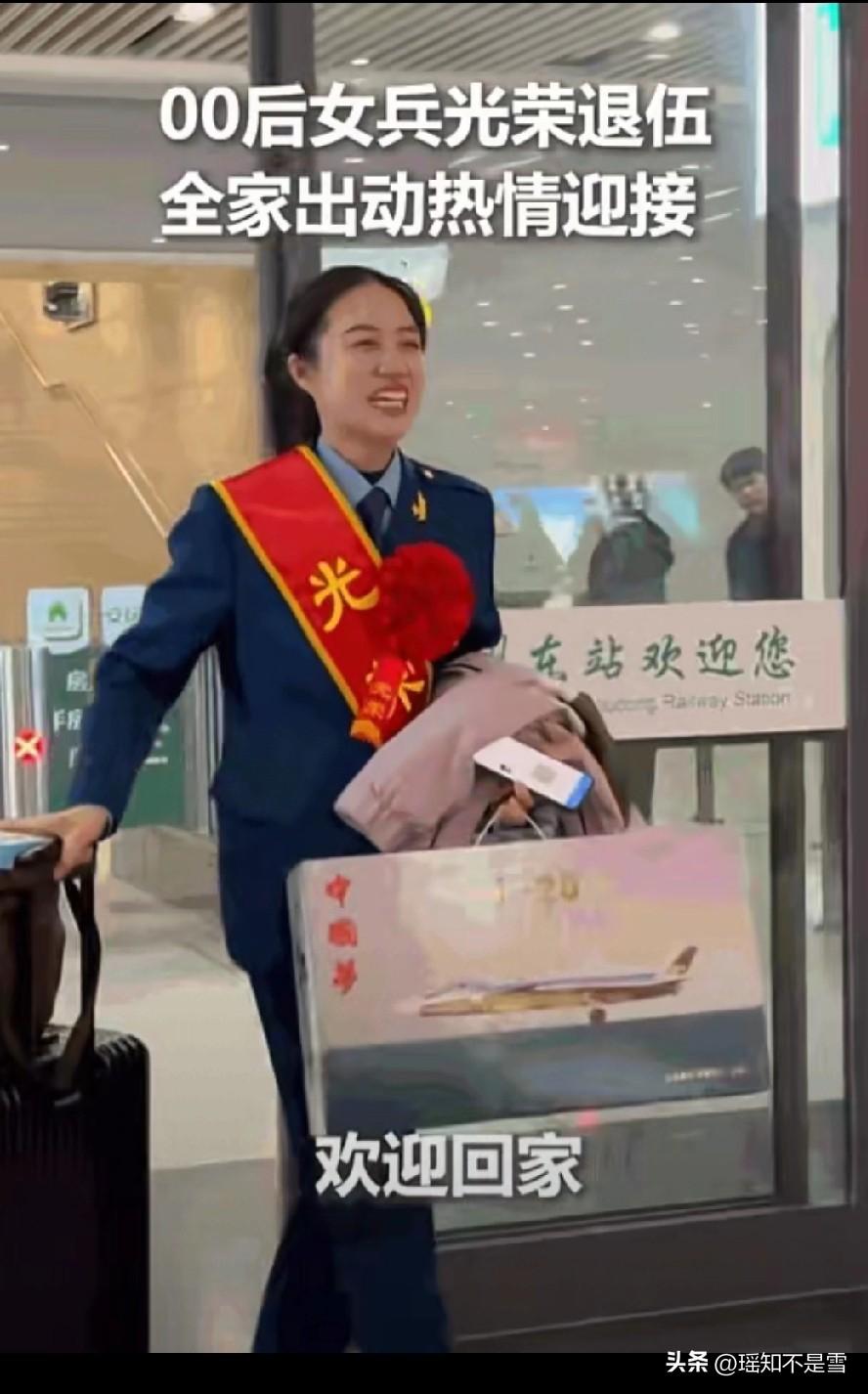 上人民日报了! 浙江杭州,00后女兵退伍,原以为只是爸爸妈妈来迎接,没想到当她右手拖行李箱,左手手提J20航模到达出口时,一大家子都在出口迎接,齐声大喊:欢迎回家! 网友说:太飒了,当过兵气质就是不一样。 镜头里的姑娘叫妞妞,常年训练练就的挺拔身姿,右手的行李箱装着两年军旅的全部行囊,左手的歼-20航模,是她藏了整个军旅生涯的热爱与执念。 她走出出站口的瞬间,整个人都愣在原地,原本只盼着和父母简单相拥,转头就被十几位亲人围在中间,那句整齐又响亮的欢迎回家,直直撞进心里,让这个在部队里从不掉泪的姑娘,瞬间红了眼眶。 妞妞是土生土长的杭州00后,从小在西湖边长大,江南姑娘的温婉里,藏着一股不服输的倔强劲。 两年前,她放弃了安稳的升学计划,主动报名应征入伍,身边不少人觉得女孩子没必要吃军营的苦,安安稳稳过日子就好,可她心里清楚,青春不该只有安逸,能穿上军装守护家国,才是最值得的选择。 她抱着这样的初心,通过层层体检与考核,顺利踏入军营,开启了属于自己的军旅征程。 军营的日子没有影视剧里的轰轰烈烈,全是日复一日的扎实训练。清晨的队列操练,烈日下的体能考核,深夜的岗哨值守,这些看似枯燥的日常,一点点磨去她的稚气,练出了刻在骨子里的坚毅。 她从一开始跟不上训练节奏,手脚发酸也不肯停下,到后来各项考核全优,靠的就是不肯认输的劲头。 部队教会她的,不只是标准的动作和严谨的纪律,更是责任二字的千钧重量,让她明白守护家国从不是一句口号,而是藏在每一次坚守、每一次付出里。 那架歼-20航模,不是随手挑选的纪念品。妞妞从小就关注我国航空航天事业的发展,看着国之重器一次次翱翔蓝天,守护祖国领空,心里满是自豪。 参军后,这份热爱愈发浓烈,她知道自己在军营的每一份坚守,都是在为国防事业添砖加瓦,这架航模,是她对祖国蓝天的告白,也是给自己两年军旅生涯最特别、最有意义的纪念,更是她心中家国情怀的具象表达。 家人的迎接,藏着两年的牵肠挂肚与满心骄傲。父母提前半个月就悄悄联络了所有能到场的亲人,从白发苍苍的长辈到懵懂年幼的晚辈,一大家子人早早守在出站口,没有华丽的布置,没有刻意的排场,就想给她一场最用心、最温暖的归家仪式。 两年的分离,电话里的报喜不报忧,所有的牵挂与思念,全都在这一刻化作最朴素的拥抱与问候,没有多余的话语,却满是藏不住的爱意。 这段视频被人民日报转发后,很快登上网络热搜,评论区里满是网友的点赞与感慨。 大家夸赞的从不是热闹的场面,而是这个00后姑娘身上的飒爽与担当。很多人对00后的印象还停留在娇生惯养、追求个性,可妞妞用行动彻底打破了这份偏见。 这一代年轻人早已长大,他们敢吃苦、能坚守、有信仰,愿意把最美好的青春献给祖国,军装穿在身上是沉甸甸的责任,脱下来是刻进骨子里、永远不会消散的荣光。 这一幕能被主流媒体关注与报道,恰恰因为它藏着最动人、最朴素的家国情怀。一个普通女兵的退伍归途,是一个小家庭的团圆,更是无数军人家庭的真实缩影。 无数年轻人像妞妞一样,告别舒适的生活、告别至亲的家人,义无反顾走进军营,用青春与热血守护万家灯火,而家人始终站在他们身后,用最温暖的守候与支持,撑起每一份沉甸甸的家国担当。 军旅两年,青春无悔。脱下军装的妞妞,依旧是眼里有光、心中有火的00后,部队赋予她的自律、勇敢、坚守与担当,会伴随她走过往后的每一段人生道路。 平凡的瞬间里,总能藏着最动人的力量,这力量来自当代青年的赤诚初心,来自家人的温情守候,更来自每一个普通人对家国最深沉的热爱。 各位读者你们怎么看?欢迎在评论区讨论。