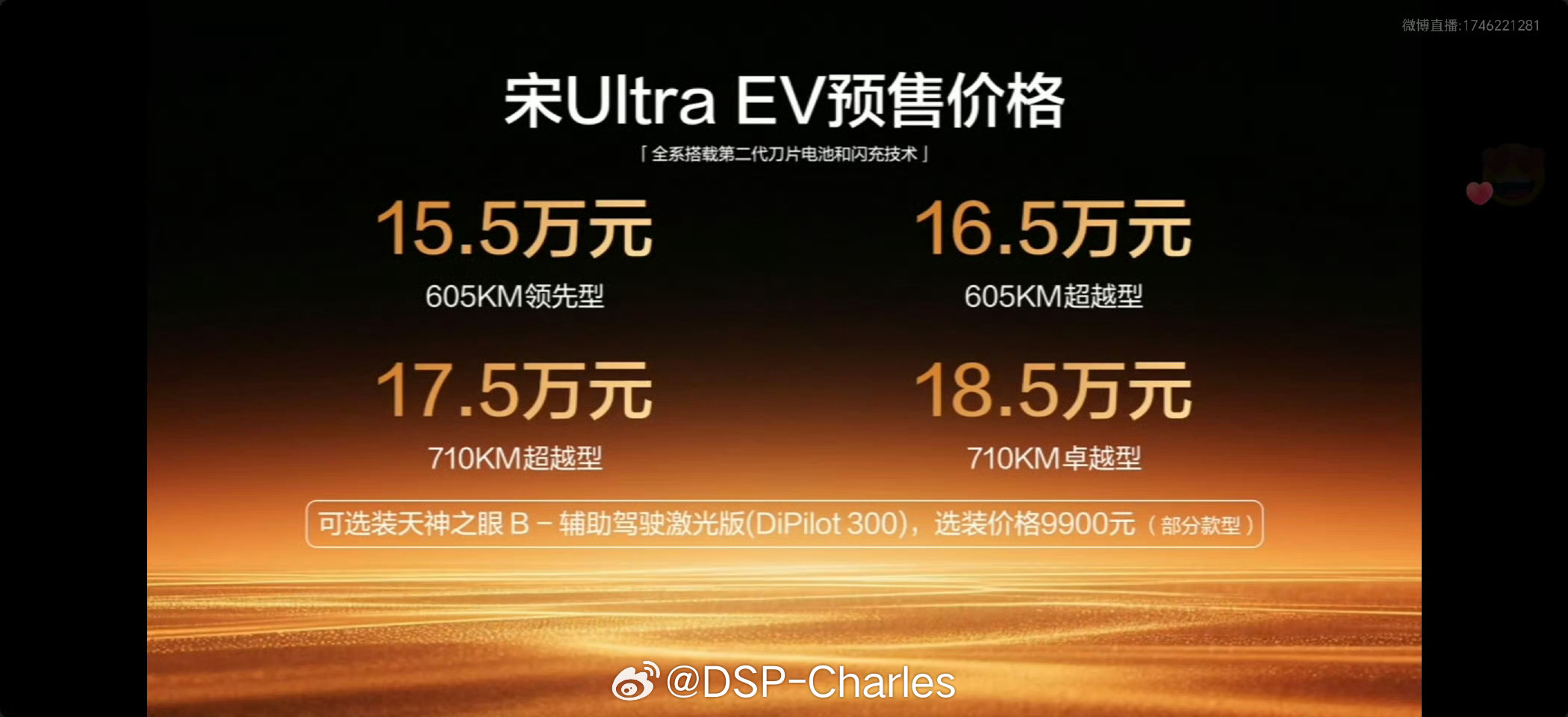 比亚迪王朝宋Ultra EV预售价15.5-18.5万元,预订用户可享18个月免费闪充权益。