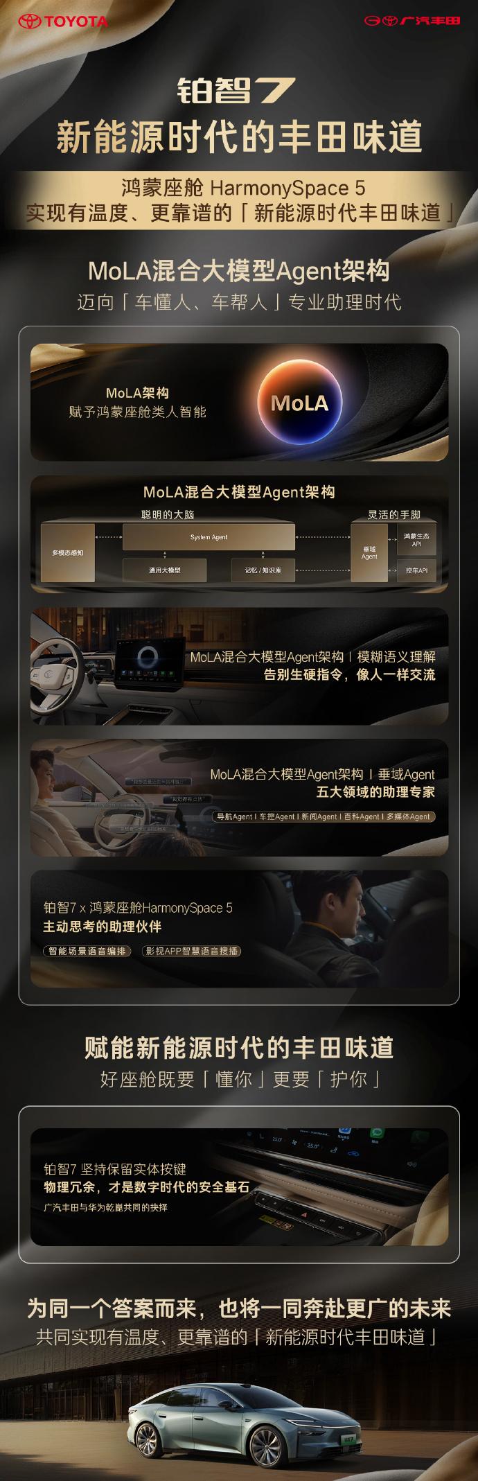 今年刚过完年,“豪华品牌大降价”的消息就刷屏了。 不过啊, 我觉得2026年,降价的策略不一定有过去那么好使了,要抢占市场,还是要从性能上下功夫。 在中国市场上深耕几十年的广汽丰田,也看到了这一点。 3月5日,广汽丰田旗下全新纯电旗舰轿车铂智7开启预售,预售价为15.68万起 这个价格是比较亲民的,不过仔细了解完新车后我发现,它还有比价格更吸引人的。 以前很多人说合资品牌造不好新能源车,无非是看到了它们在智能化方面的短板,但从铂智7的表现来看,这个短板已经被解决了。 座舱方面,铂智7全系标配鸿蒙座舱5.0,具备强大的模糊语义理解和多音区连续对话能力。 与此同时,它还搭载了MoLA大模型,拥有长期记忆功能,并在此基础上提供主动服务。 辅助驾驶仓面,铂智7搭载Momenta高阶辅助驾驶系统,拥有27个高规格传感器以及Momenta R6飞轮大模型。 鸿蒙座舱5.0不用多说,它已经成为国内罕见的拥有跨品牌影响力的智能座舱;而Momenta R6也有30亿公里的实战数据作为支撑。 这两个,可以说是目前车载智能的一流组合。借用中国成熟的产业链,迅速搭建起产品优势,这是一种很理性的策略。 当然,广汽丰田也有自己的拿手好戏,它为铂智7配备了双腔空悬+SDC减震器+底盘预瞄系统,底盘由雷克萨斯和丰田GR团队联合调校,为用户带来豪车级的乘坐体验。 除此之外,铂智7还提供了5129mm的车长以及3020mm的轴距,车内则提供Nappa牛皮材质座椅、仿麂皮顶棚、副驾零重力座椅等豪车级配置。 实际上,广汽丰田的铂智系列新能源车型在2025年就已经崭露头角;相比之下,今年的铂智7更进一步,消费者想要的基本都配齐了。 广汽丰田会不会依靠越来越强大的新能源家族,打一场彻底的翻身仗呢?丰田铂智7预售权益价15.68万起