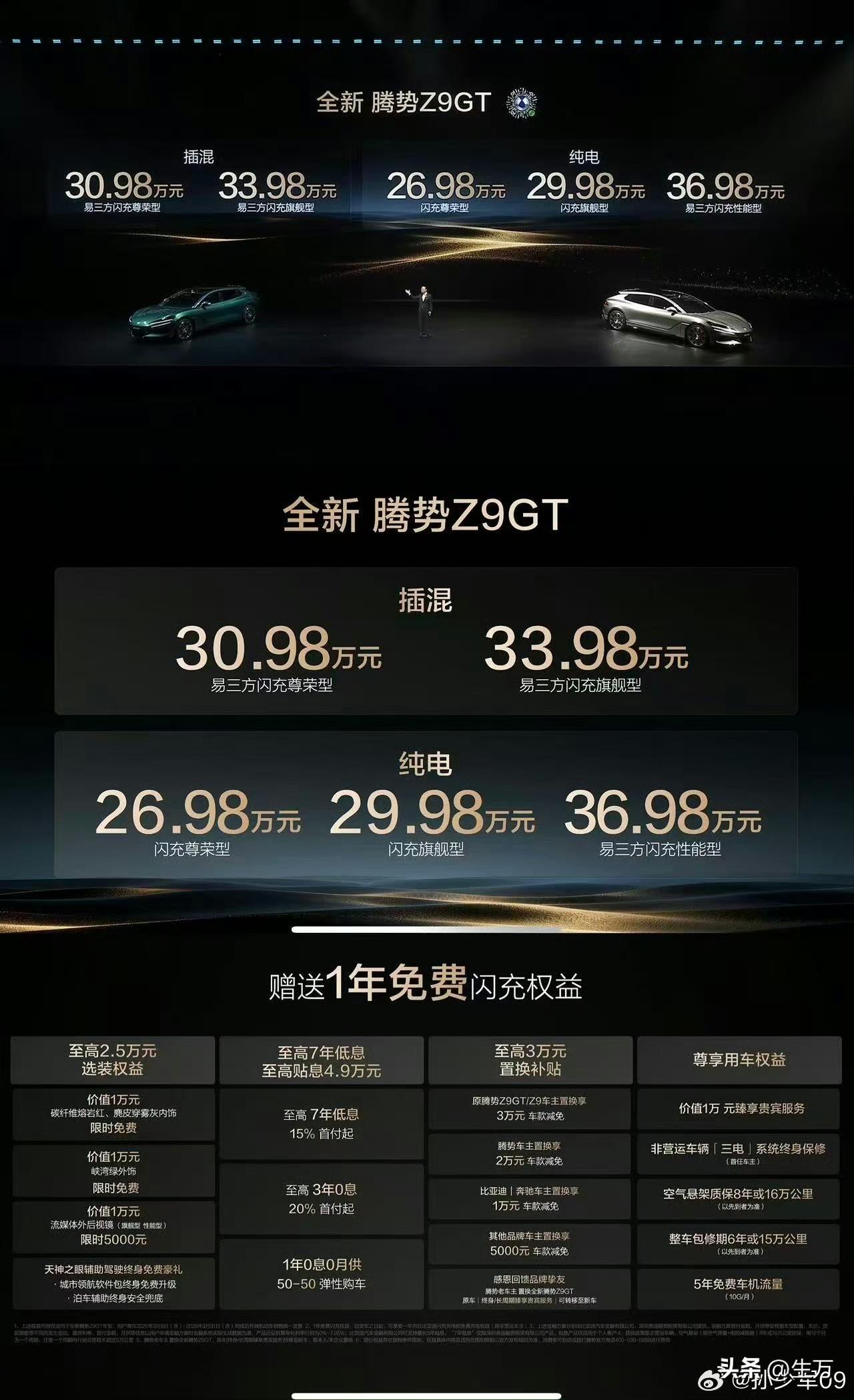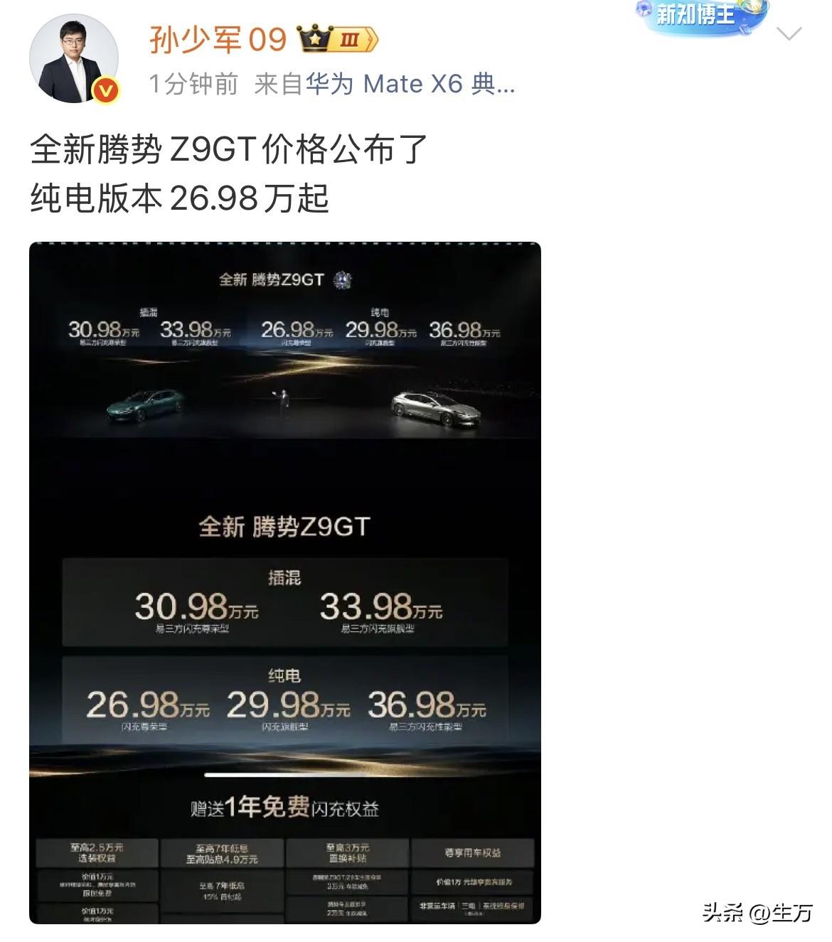 26.98万[捂脸]全新腾势Z9GT价格公布了! 今天晚上,王传福刚刚发布完了第二代刀片电池技术之后,很多用户期待的腾势Z9GT随之也出来了! 而且从入门到30多万,那个顶配,全系同步都采用第二代刀片电池加闪充技术,以前卖三四十万的腾势Z9GT,今天晚上直接杀到26.98万起[捂脸] 一共是五个版本,区别还是蛮大的有100,000的价差,当然有人说为啥现在的插会还稍微贵了一点点,根本的原因是他们的标配都用了易三方的发电机,而纯电也只有顶配版本才有这个配置。 当然,除了这个车本身的价格之外,可能有用户更加关心的是王传福今天晚上宣布的这个权益,那就是只要今天晚上开始,买了他们的第二代刀片技术电池的用户,都可以享受一年以内免费充电的权益。 不知道有没有用户核算一下,就正常跑的情况下,一年充电,包括充电费用和服务费用加起来多少钱,对于一些经常喜欢跑长途,一年跑好几万公里,甚至更多的用户来说,这个权益便宜确实还是比较诱人的。 所以相对来说,这个价格对于老车主是比较友好的,只要看重自己像你的配置,再加一点点,那么他整体的性价比可以说是很可观的。 当然,萝卜青菜各有所爱,这个价格其实也可以买到很多同类型的车了,这就要看每个人的用车场景和对品牌的喜爱程度了。