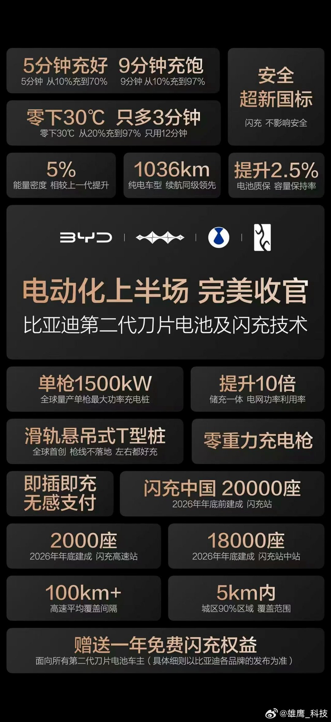 比亚迪第二代刀片电池及闪充技术正式发布5分钟充好,9分钟充饱,零下30℃,只多3分钟闪充中国,让闪充遍布全国,比亚迪再一次用技术,改变世界!比亚迪发布二代刀片及闪充