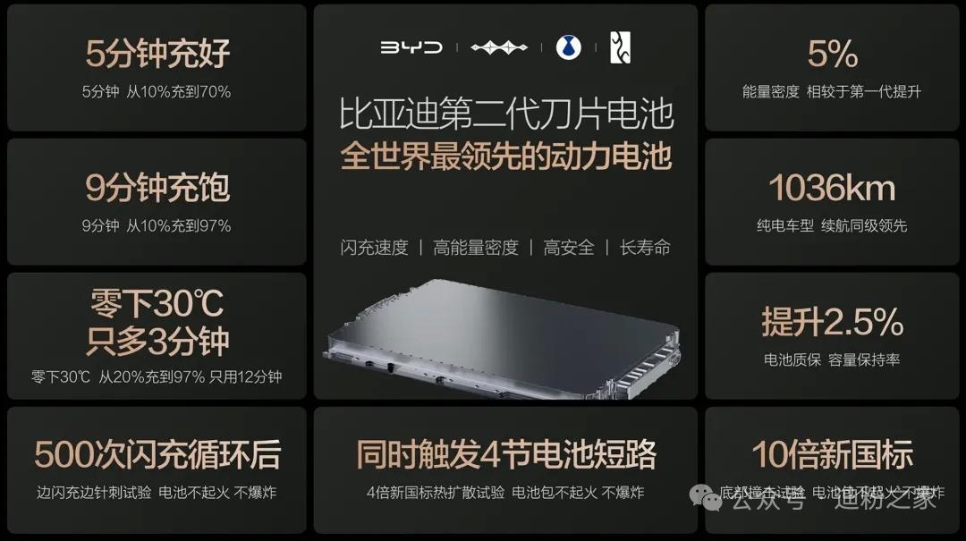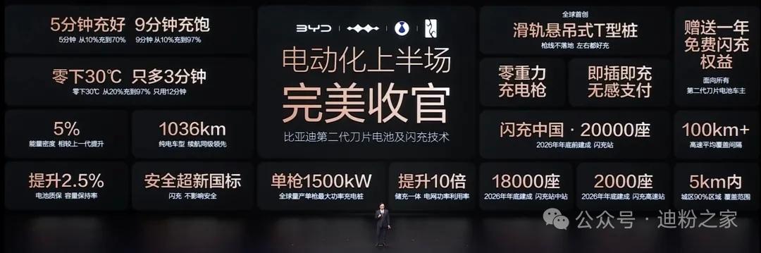 今日,比亚迪第二代刀片电池及闪充技术发布会上,比亚迪董事长王传福发表讲话。 第二代刀片电池相关性能介绍,以超越新国标的标准打造最安全的电池。 王总用通俗易懂的词汇给大家进行介绍:“5分钟充好,9分钟充饱,零下30℃只多3分钟”。 实测比亚迪10款车型,全部都是9分钟内充饱。 关于充电站方面,2026年底建成20000座,其中2000座在高速服务区。 同时,王总宣布:“即日起,所有搭载第二代刀片电池的闪充车车主,赠送1年免费闪充权益”。 以上绝对是本场关于第二代刀片和闪充技术的干货了!这技术绝对厉害【来自懂车帝车友圈】