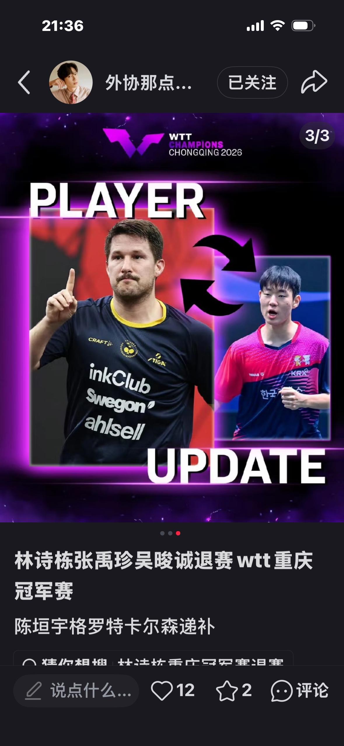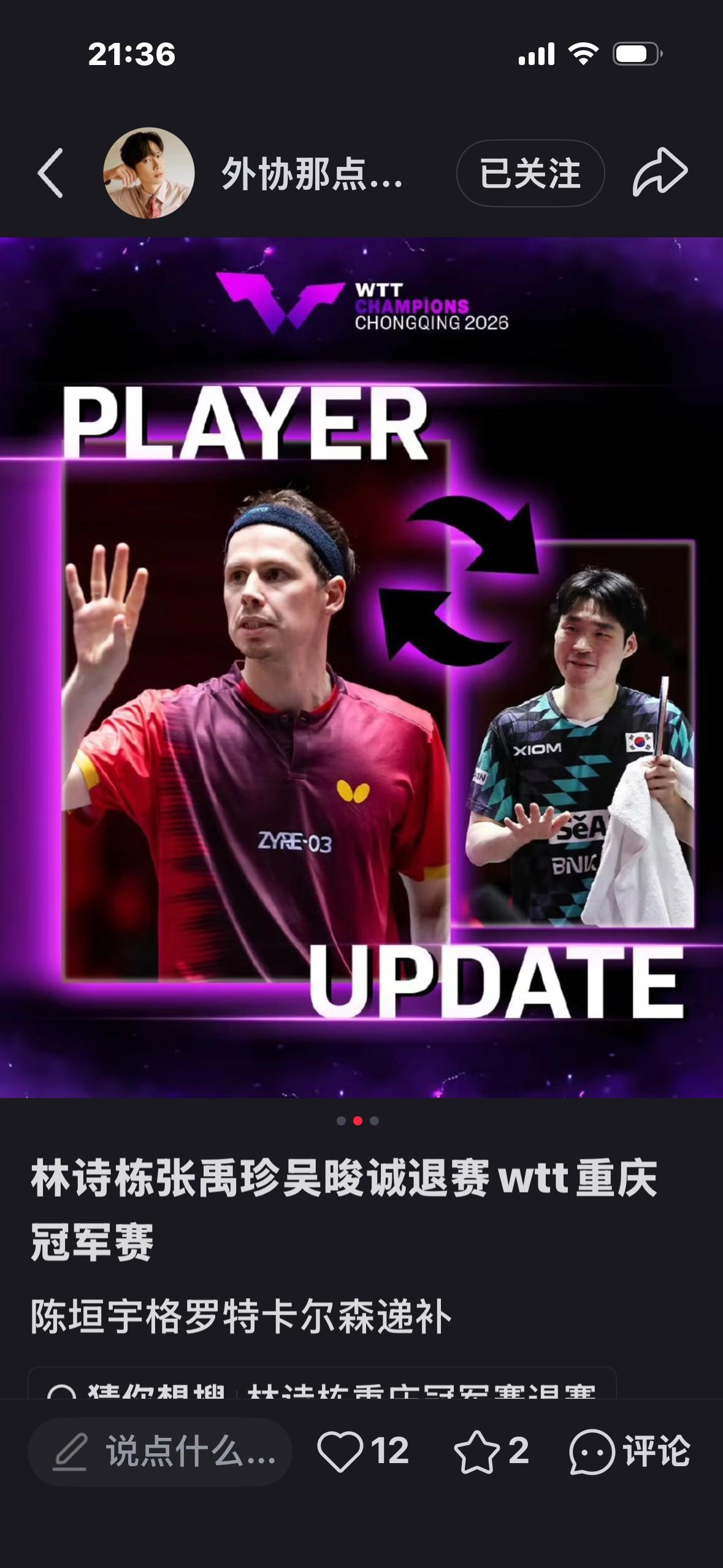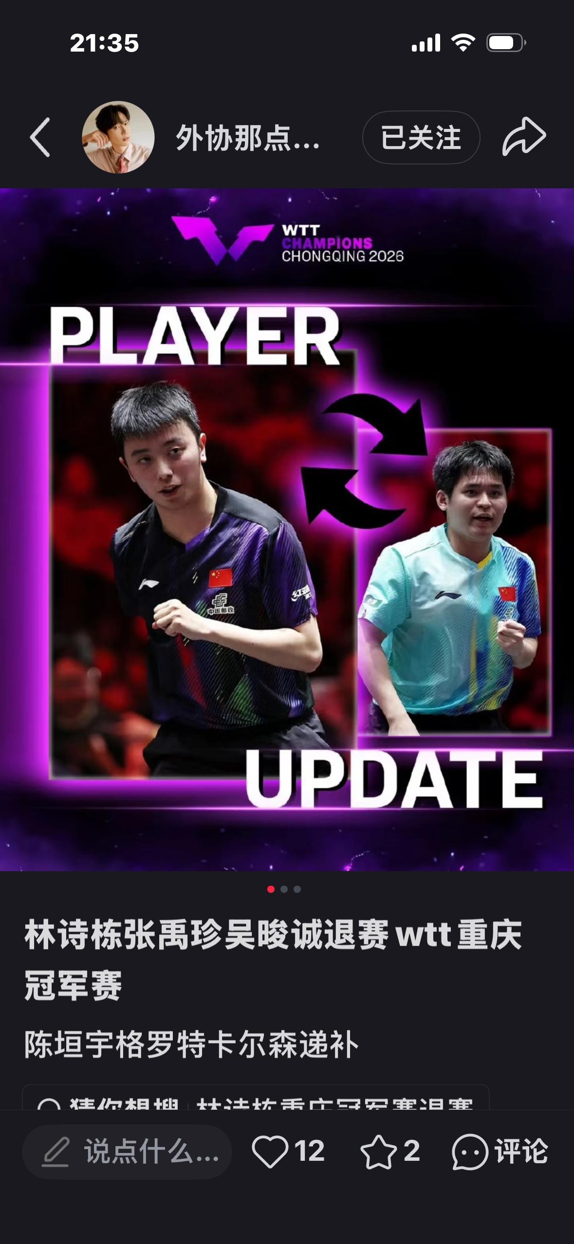 重庆冠军赛抽签仪式:3月8日下午3点,孙颖莎 王楚钦参加抽签! 重庆冠军赛3月10日至15日在 重庆举行。 林诗栋,张禹珍,吴俊诚退赛, 陈垣宇,格罗特,卡尔森替补, 3月8日,国乒上午出征重庆冠军赛, 下午孙颖莎和王楚钦参加抽签, 国乒共出征14人的超级豪华阵容 参赛! 男队:王楚钦 梁靖崑 向鹏 周启豪 温瑞博 黄友政 陈垣宇 女队:孙颖莎 王曼昱 陈幸同 蒯曼 王艺迪 陈熠 石洵瑶 勒布伦兄弟与莫雷加德和迪博 目前还在一起训练, 备战重庆冠军赛, 周日将赶往新加坡 参赛!