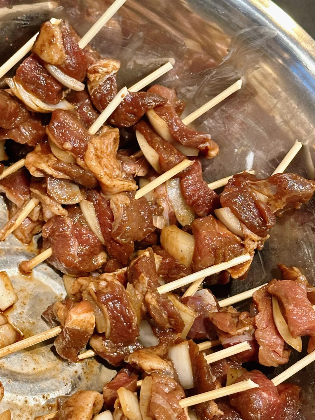 拌匀的羊肉和洋葱腌制两三个小时,最好隔夜更加入味,第二天取牙签,按一块羊肉一块洋葱那样交替串,我没有牙签,就用烧烤竹签掰断了代替;