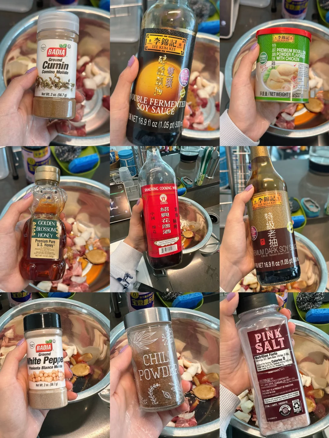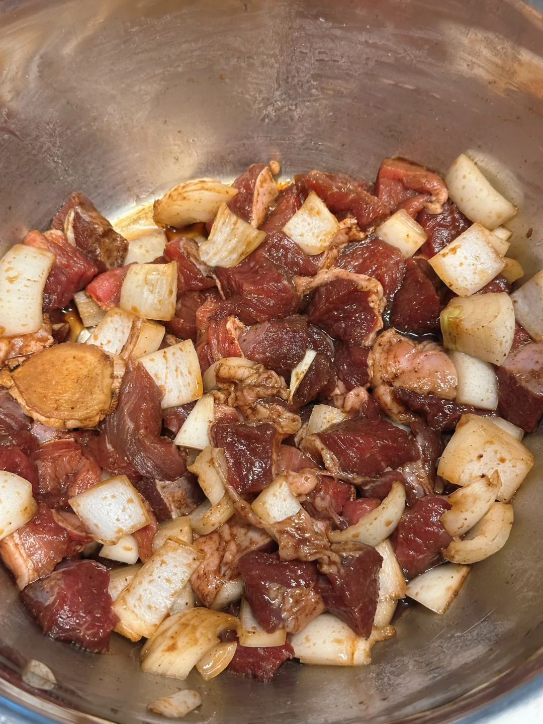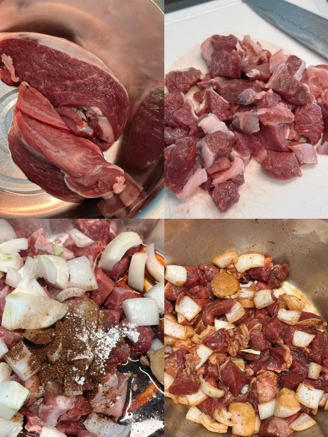 羊肉切成边长一厘米左右的小丁,洋葱也切丁,加入调料拌匀腌制,调料说实话我没有称量,是凭手感加的,基本上看到肉均匀上色,搅拌时候能闻到香气就对了,可以根据自己口味增减香料浓度和甜咸度;
