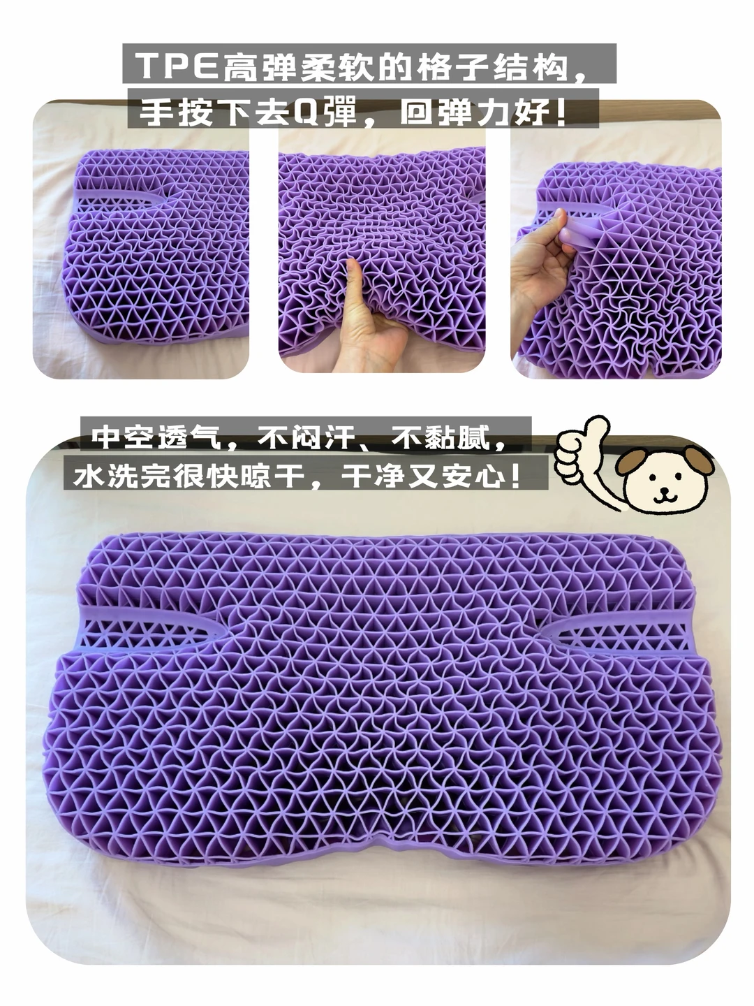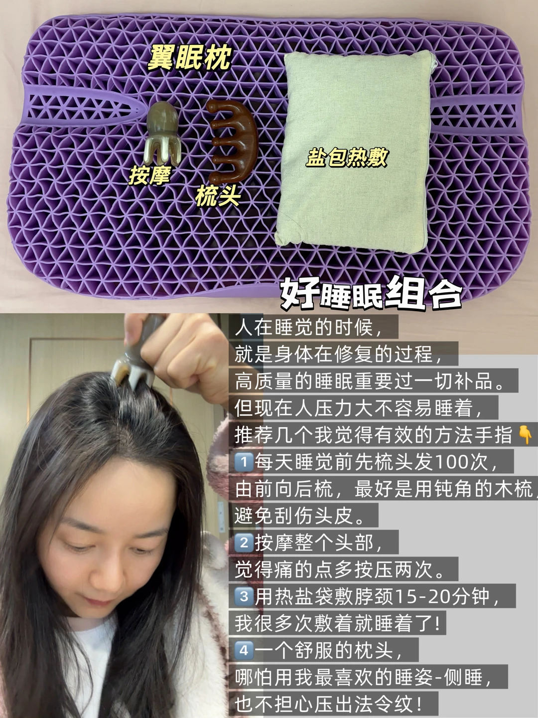 🌟升级版助眠仪式(图6-7)现在的睡前仪式是:头部按摩+热盐袋敷脖子+躺在翼眠枕头上。早上醒来后,我会直接躺在枕头上做一组FME面部肌肉训练。这个枕头的TPE材质像果冻一样Q弹,能稳稳托住颈椎,做训练时发力更精准,下颌线也越练越清晰。