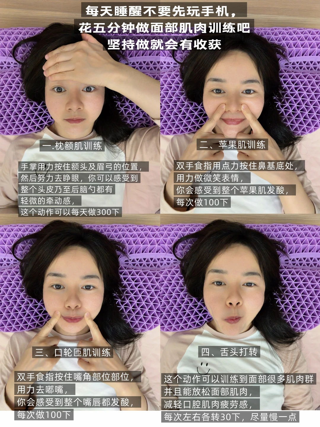 🌟复刻干货:我的变美系统(图2-4)再次划重点:早起补阳气,坚持运动增肌,饮食减糖,热盐袋敷颈椎,配合FME面部训练。这些是底子,但如果睡眠姿态不对,底子再好也经不起每天8小时的挤压。