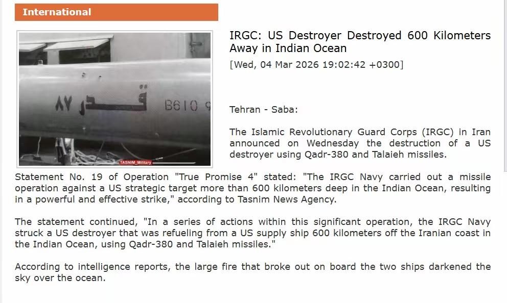 美“阿利·伯克”级驱逐舰或遭受伊朗导弹袭击着火。 3月4日,伊朗伊斯兰革命卫队发布“真实承诺﹣4”行动第19号公告,称使用卡德尔﹣380导弹成功命中了1艘位于印度洋,远离伊朗600公里的美国“阿利·伯克”级驱逐舰。 美国军方目前尚未证实这一消息。 但据卫星热成像图片来看,这艘位于印度洋的“阿利·伯克”级驱逐舰甲板位置确实着火了。如着火原因,确实是被伊朗导弹命中,那将是这款拥有“宙斯盾”防空体系的驱逐舰,服役后首次在实战中遭遇如此惨重的损失。 以前老说波斯人只会升旗,却怂得要死。这次不得不承认,伊朗在这波的反击中,越战越勇,全面开花。 只有站起来的民族,才会有尊严和希望。跪着的,永远只能是别人牵着的宠物,随时宰割。