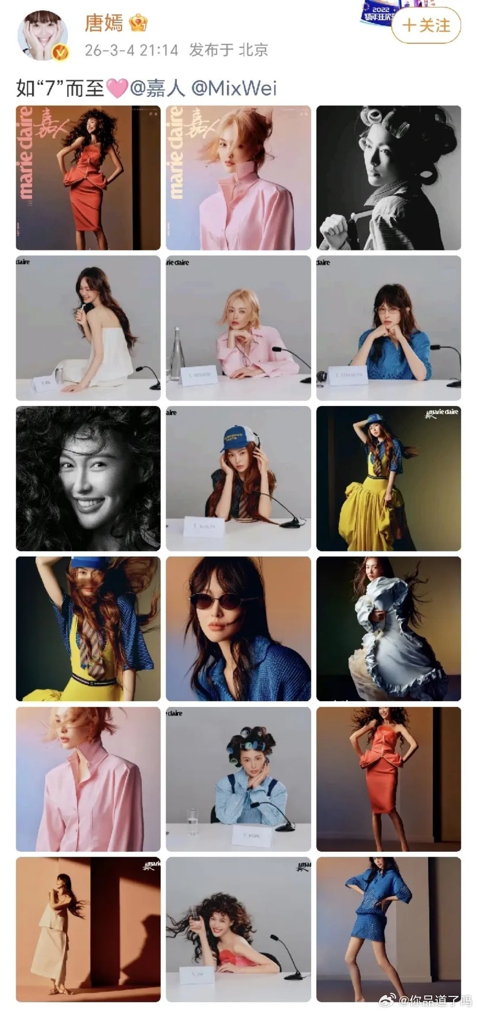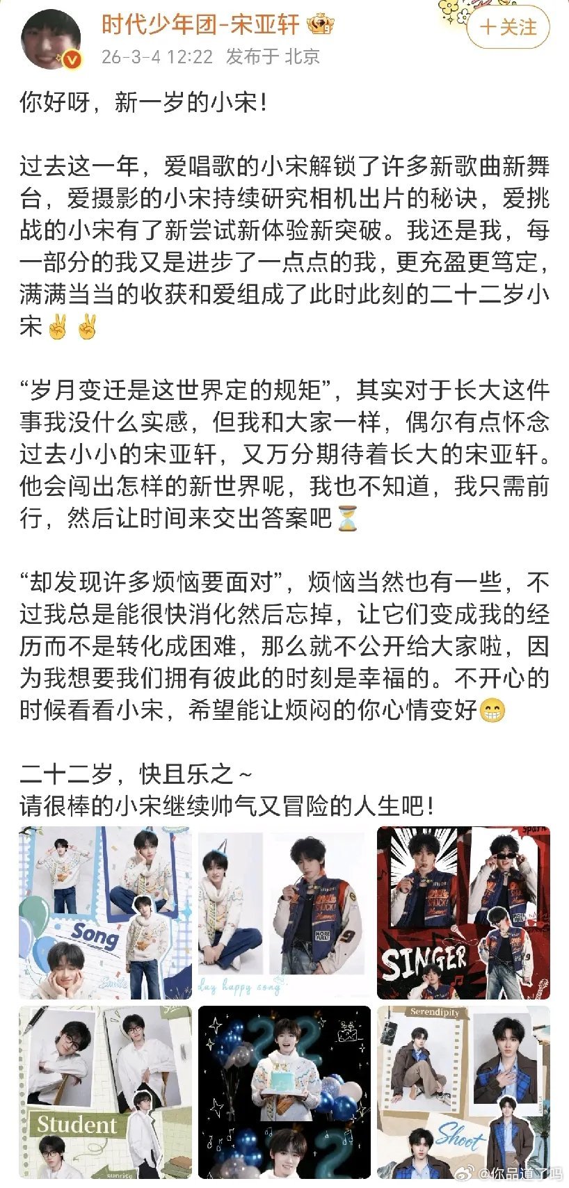 3月4日娱乐圈新鲜事速递唐嫣:如“7”而至!3月4日,唐嫣在社交平台晒出了N宫格,各种风格的照片尽显她的美。这次与嘉人杂志的合作相当不错。她艾特了嘉人发文:“如“7”而至🩷…”不同的风格,唐嫣都驾驭的相当好,有成熟风,有小清新,有很夸张的,也有很简约的。唐嫣真的是很美哟。宋亚轩22岁生日3月4日,宋亚轩迎来了22岁生日,他晒出了六宫格,发布了一篇小长文,来为22岁开启。宋亚轩分享了过去一年自己解锁的新技能,他发文:“…二十二岁,快且乐之~…”哇偶,既能爱自己,又有自信,又努力,宋亚轩真的很不错。期待未来小宋有更多好的作品与大家见面!周冠宇与周杰伦澳洲同框3月4日,车手周冠宇在社交平台晒出了坐标澳大利亚,与周杰伦一起打网球的合照,发文:“周周 🎾 ”…周杰伦还在澳洲呀,这次的旅行有点久哟。“周周”一起打球有点意思,两位都是各自领域上发展不错的人物。一起比✌,很帅气!
