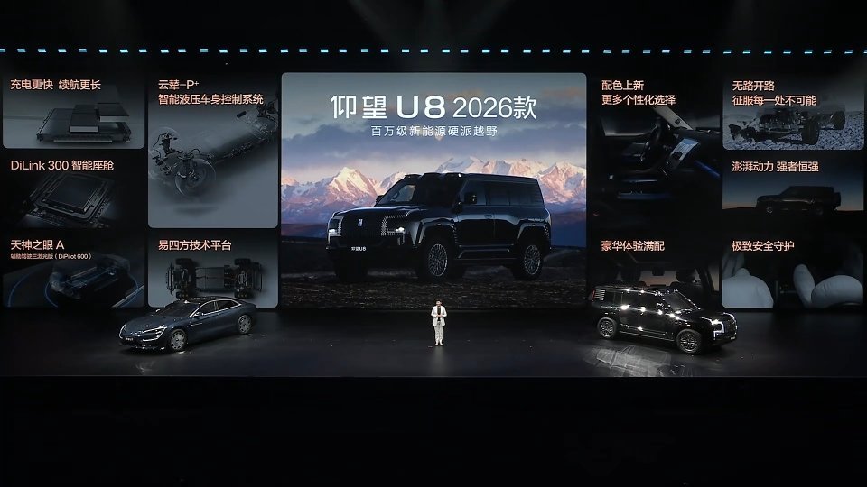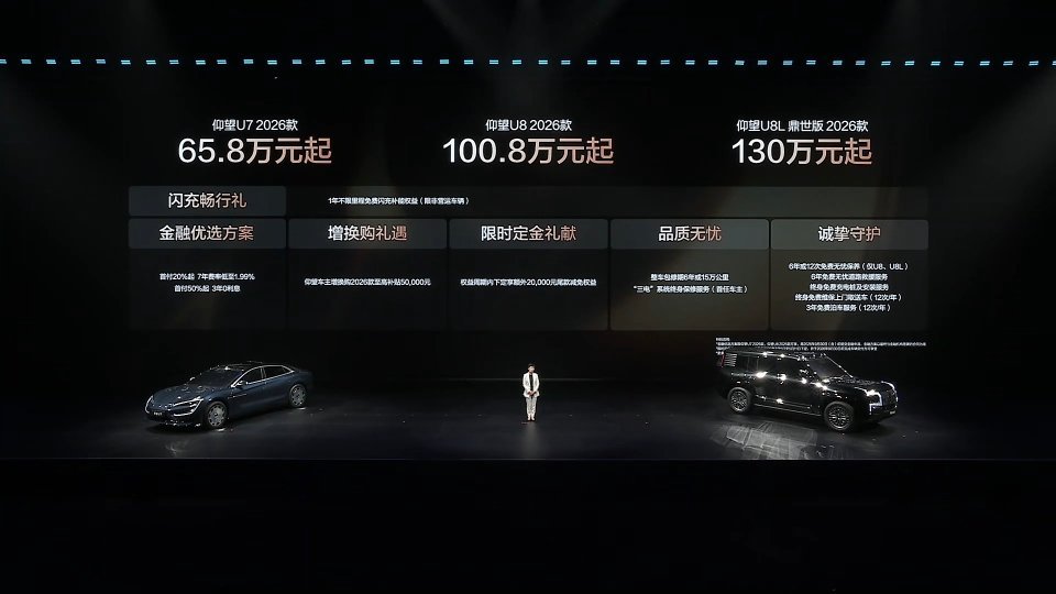 仰望加闪充,以极致加速度让你改变世界的脚步更加坚定。仰望U7 2026款 65.8万元起仰望U8 2026款 100.8万元起仰望U8L 鼎世版 2026款 130万元起三大安全升级OTA全面推送老用户应急浮水紧急自动激活| NOA爆胎稳行稳停|全场景隐私安全