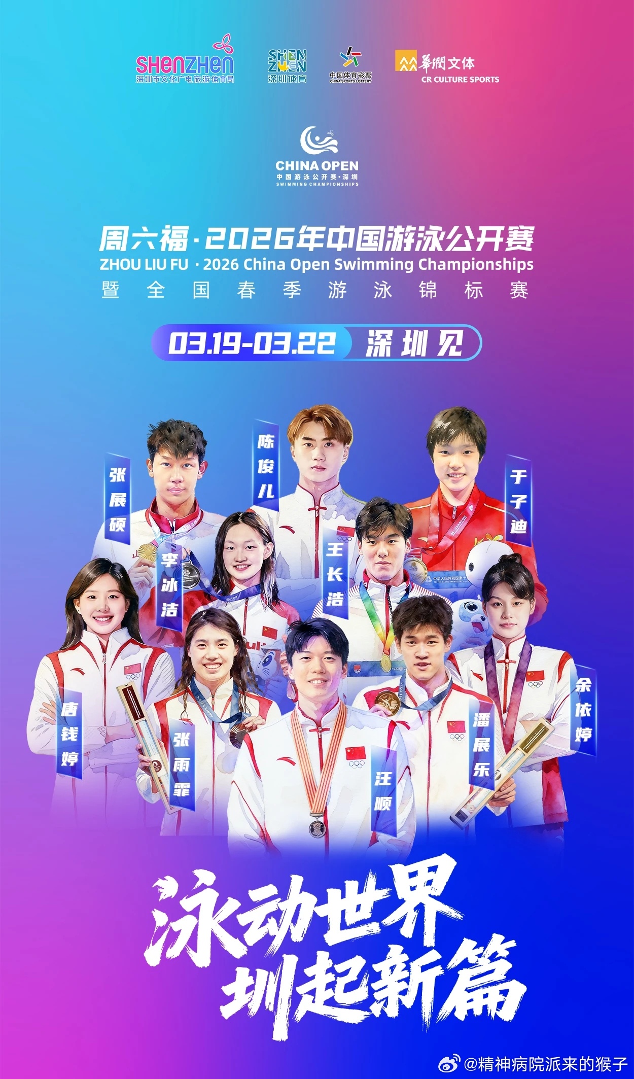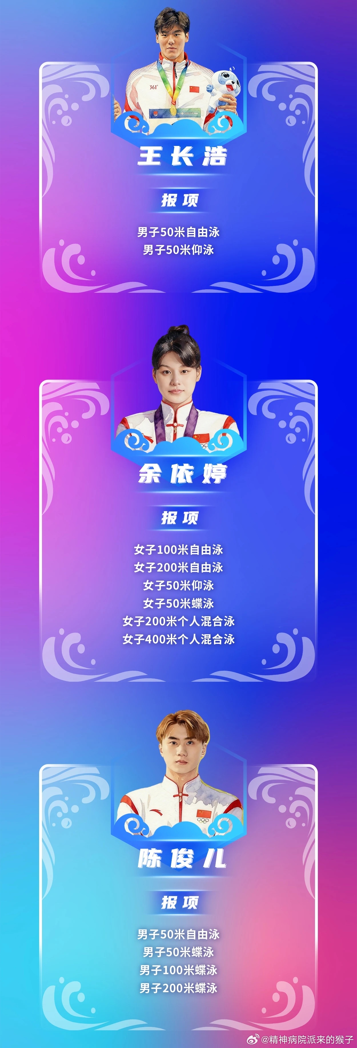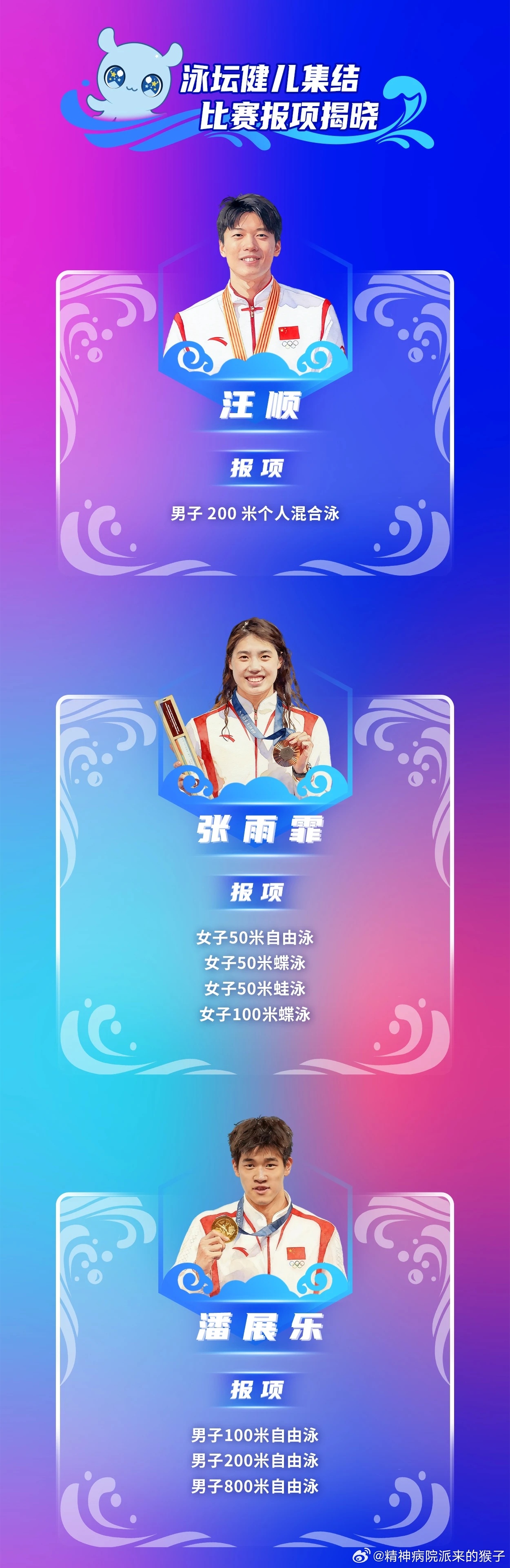 2026年中国游泳公开赛部分选手报项:3月19日-22日🏊♂️ 男子运动员报项:汪顺:男子200米个人混合泳王长浩:男子50米自由泳、男子50米仰泳潘展乐:男子100米自由泳、男子200米自由泳、男子800米自由泳陈俊儿:男子50米自由泳、男子50米蝶泳、男子100米蝶泳、男子200米蝶泳张展硕:男子200米自由泳、男子400米自由泳、男子800米自由泳、男子1500米自由泳