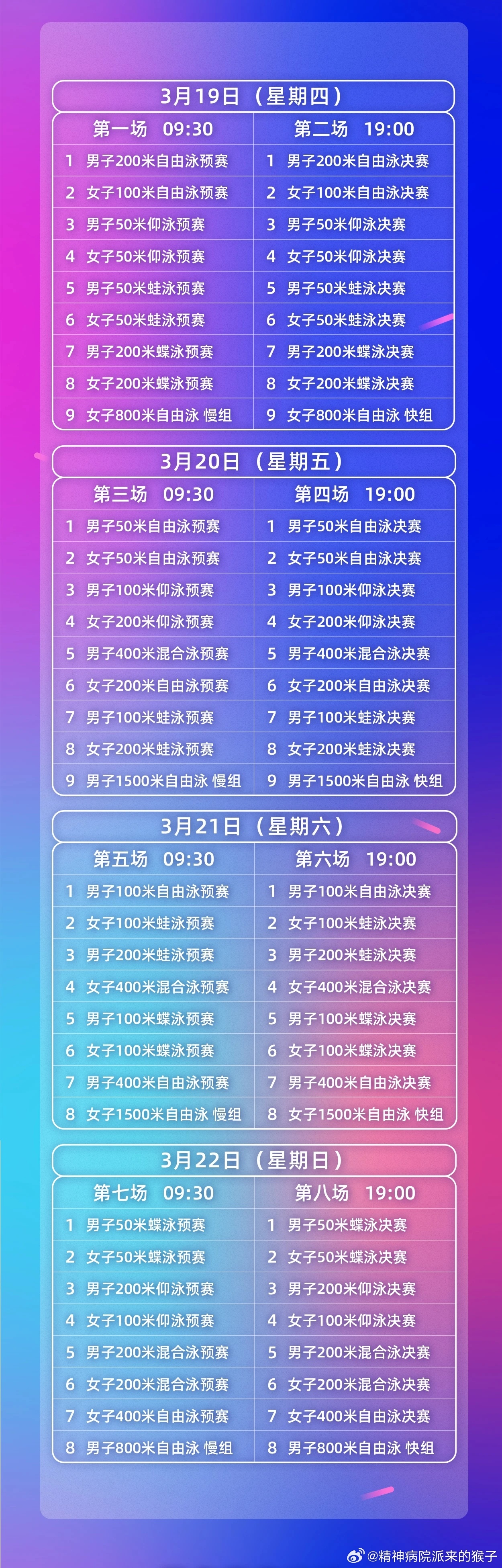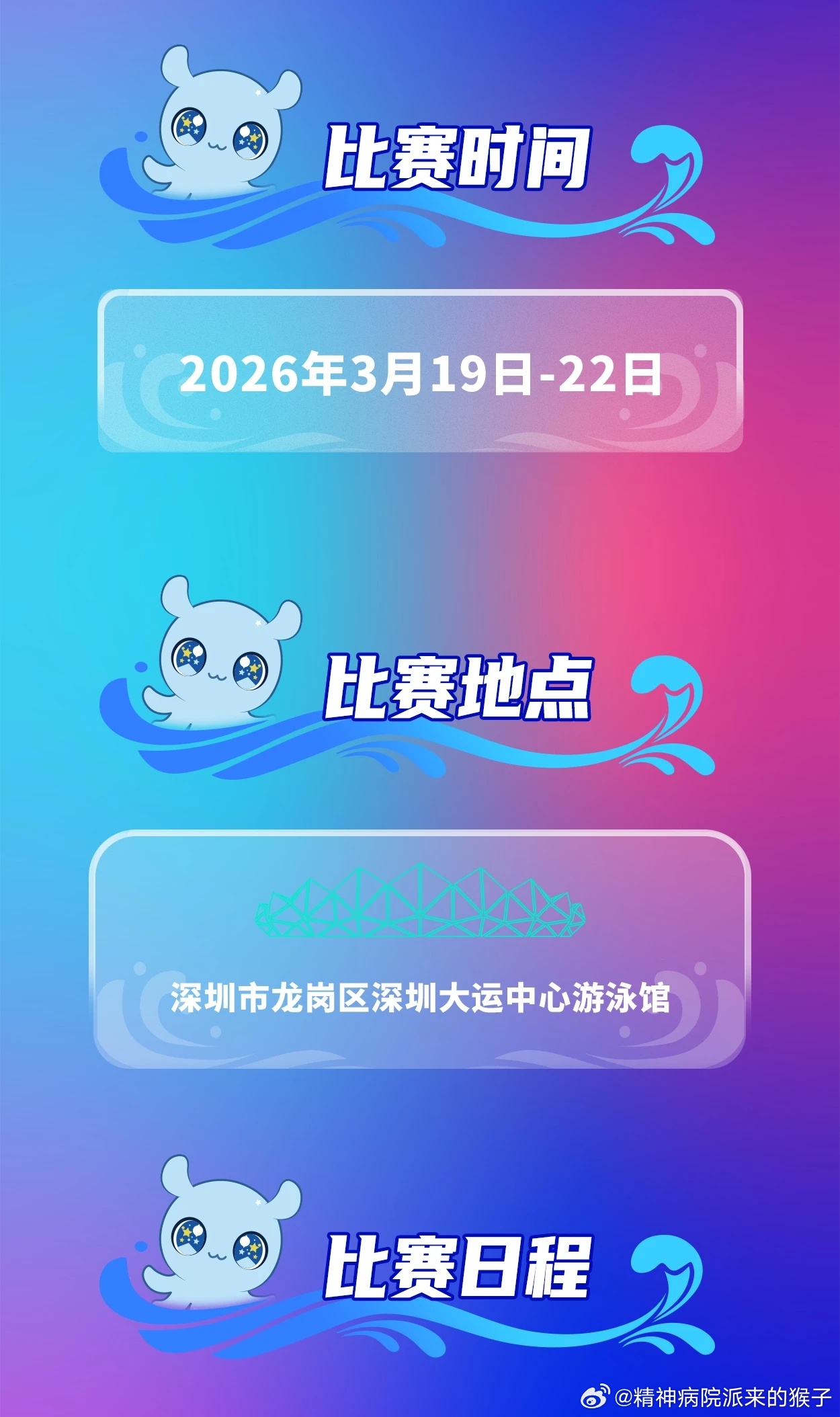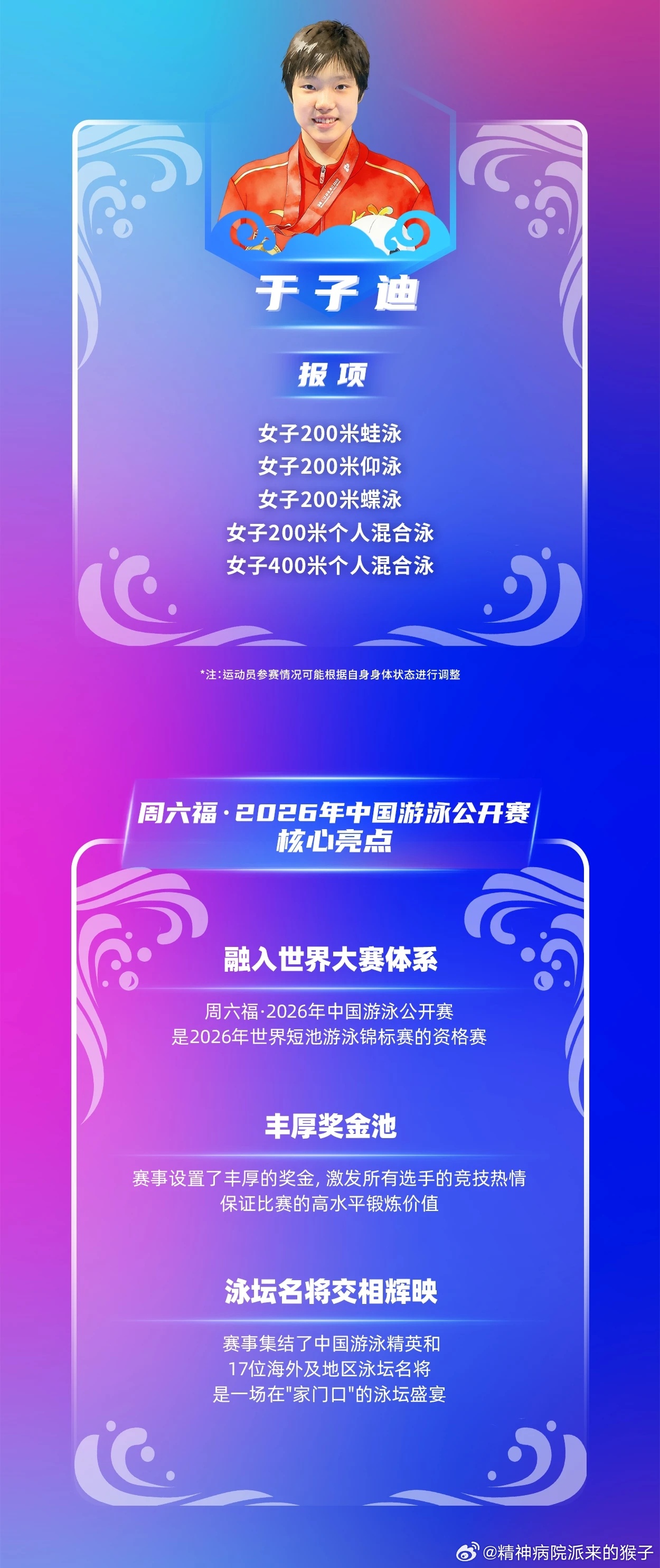 2026年中国游泳公开赛部分选手报项:3月19日-22日🏊♂️ 男子运动员报项:汪顺:男子200米个人混合泳王长浩:男子50米自由泳、男子50米仰泳潘展乐:男子100米自由泳、男子200米自由泳、男子800米自由泳陈俊儿:男子50米自由泳、男子50米蝶泳、男子100米蝶泳、男子200米蝶泳张展硕:男子200米自由泳、男子400米自由泳、男子800米自由泳、男子1500米自由泳