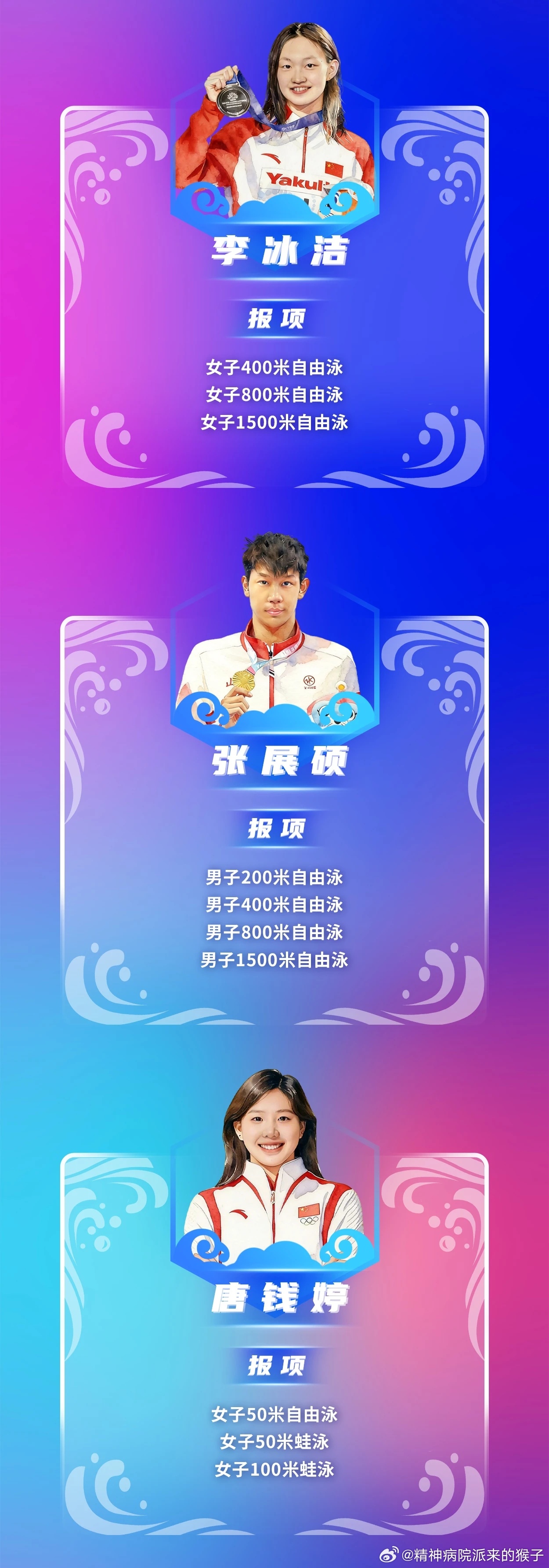 🏊♀️ 女子运动员报项张雨霏:女子50米自由泳、女子50米蝶泳、女子50米蛙泳、女子100米蝶泳唐钱婷:女子50米自由泳、女子50米蛙泳、女子100米蛙泳李冰洁:女子400米自由泳、女子800米自由泳、女子1500米自由泳于子迪:女子200米蛙泳、女子200米仰泳、女子200米蝶泳、女子200米个人混合泳、女子400米个人混合泳余依婷:女子100米自由泳、女子200米自由泳、女子50米仰泳、女子50米蝶泳、女子200米个人混合泳、女子400米个人混合泳