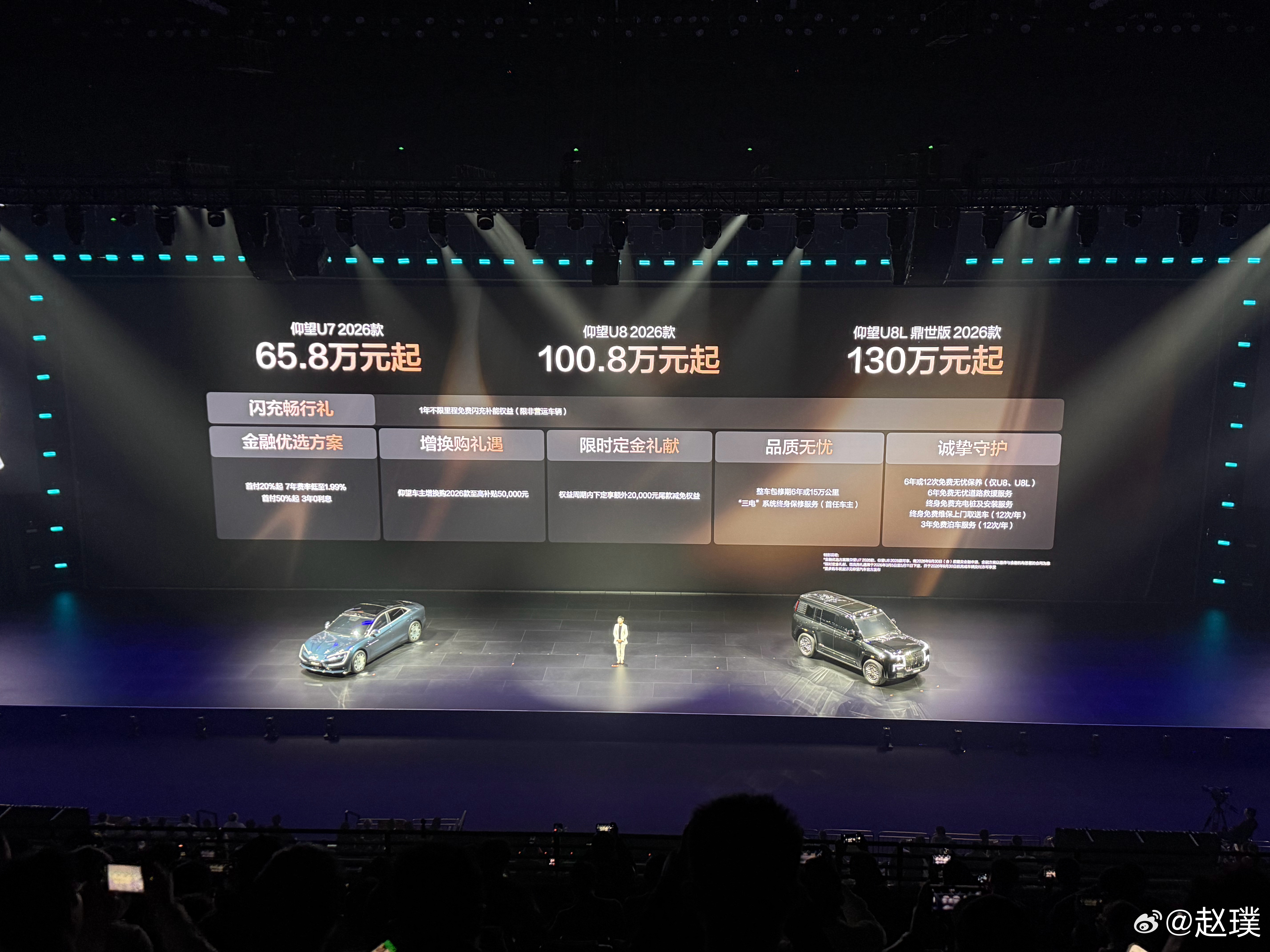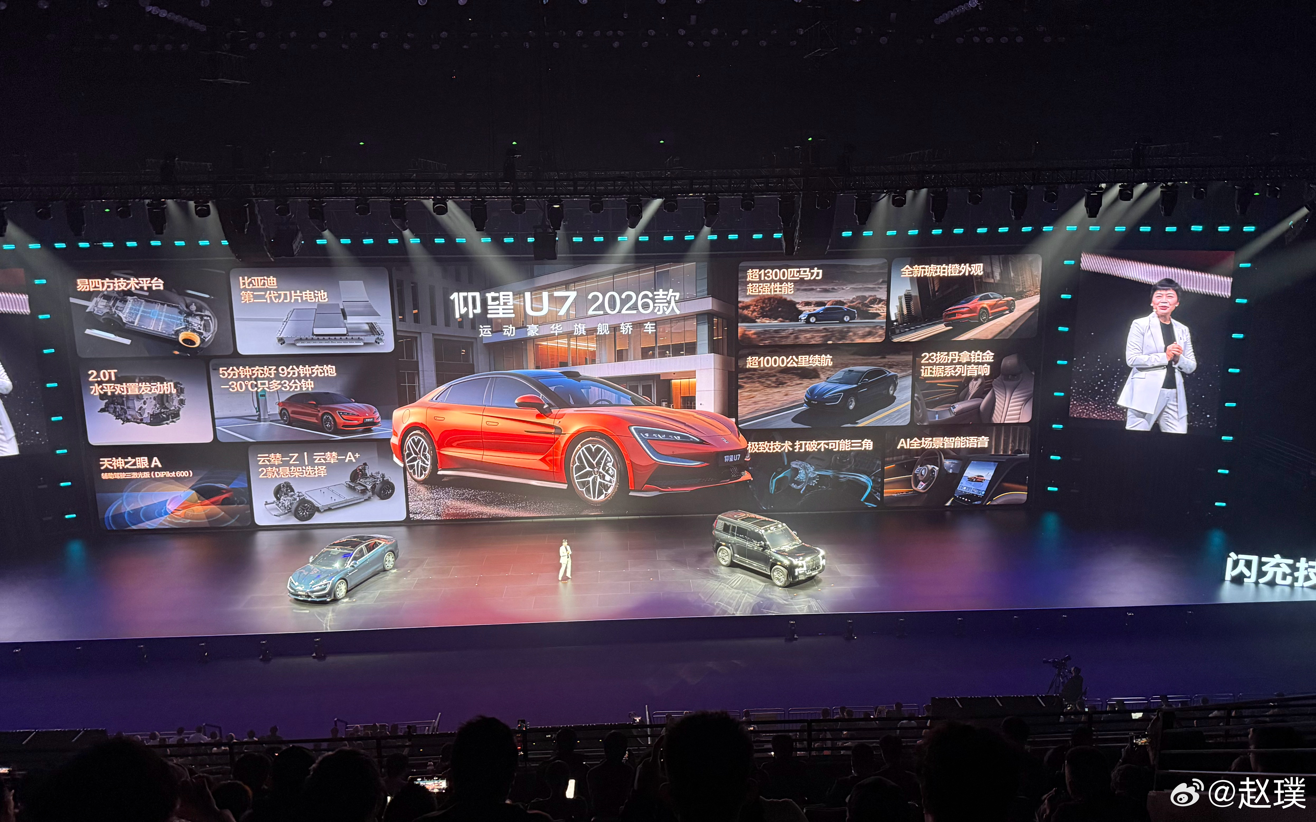 在比亚迪二代刀片电池和闪充技术的加持下,仰望上市了2026款仰望U7,售价65.8万元起。2026款仰望U8,售价100.8万元起。2026款仰望U8L,售价130万元起。仰望U7作为一款兼顾性能和长续航的车型,CLTC最大续航里程超过1000公里,最大马力超过1300匹,底盘部分有云辇-Z和云辇-A+两种可以选择。仰望U8升级了最新云辇-P+、易四方路面感知技术、更多内饰配色等。仰望U8L升级应急浮水紧急自动激活 、NOA爆胎稳行稳停、全场景隐私安全等功能。比亚迪今晚发布二代刀片及闪充新款仰望U7首搭第二代刀片电池仰望u8仰望u8l