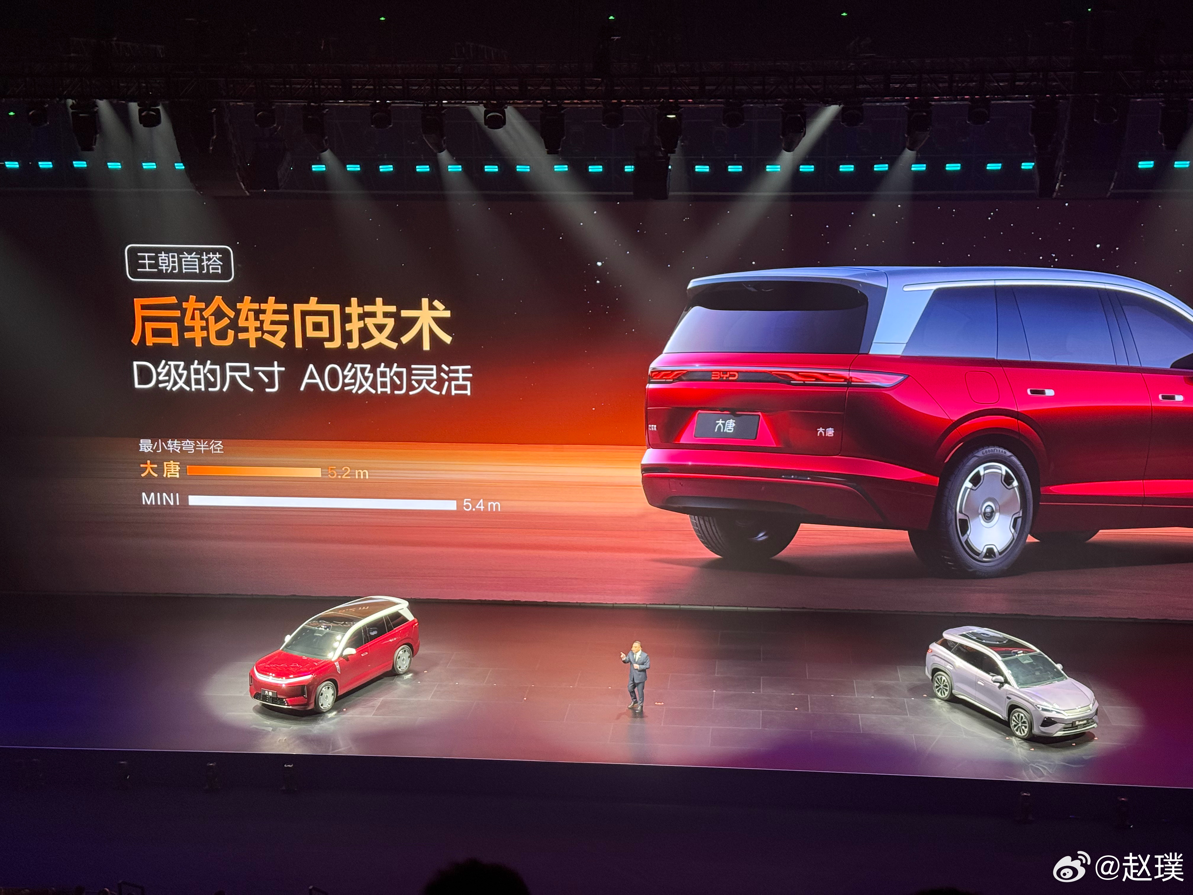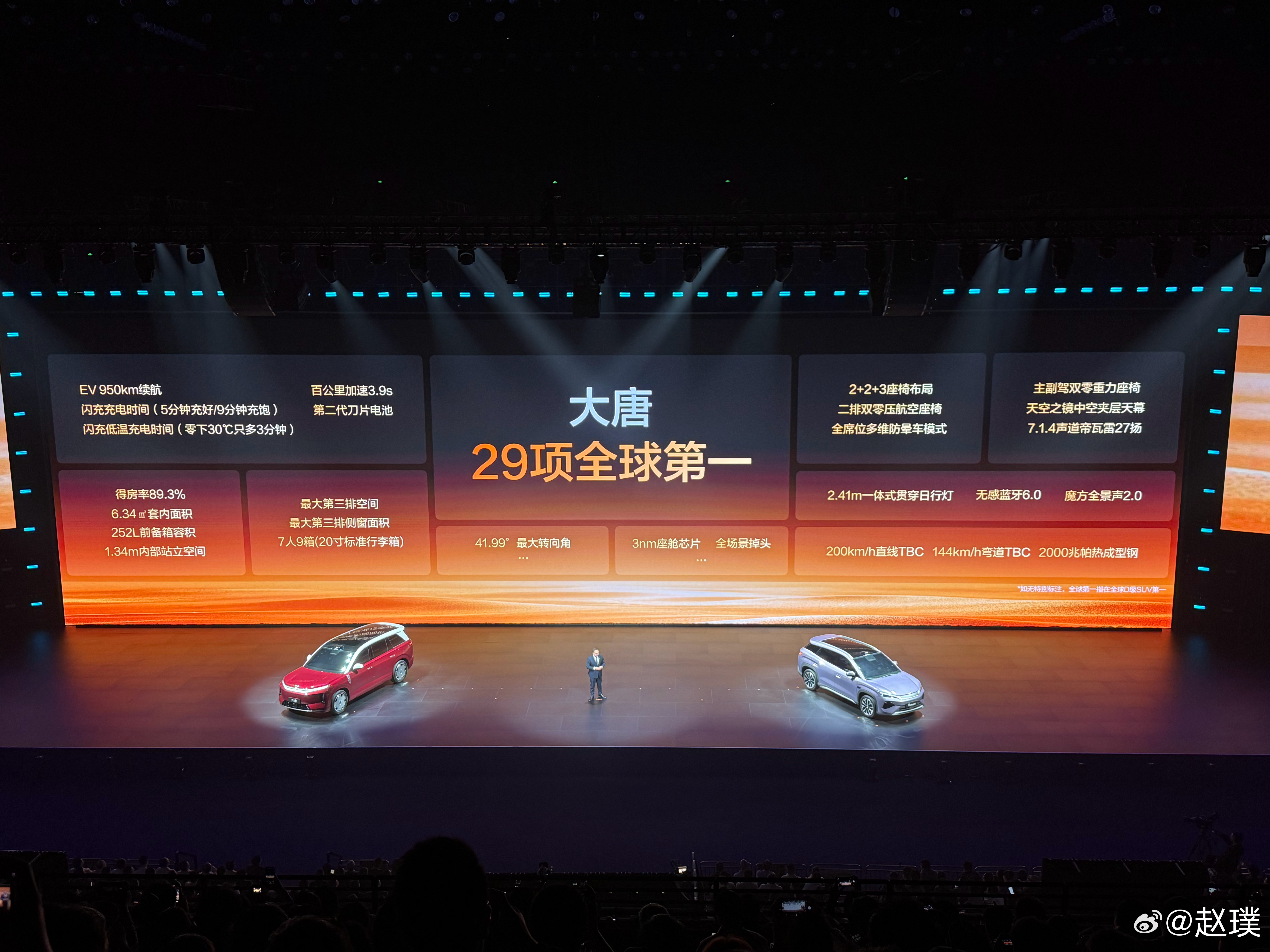 比亚迪王朝家族发布一款定位D级SUV的大唐,搭载比亚迪二代刀片电池和闪充技术,充电速度能做到5分钟充到70%,9分钟充到97%。大唐的车长将近5米3,轴距超过3米1,车内采用2+2+3座椅布局。纯电版最大续航里程950公里,最快百公里加速3.9秒,还配备云辇-A、后轮转向等功能。据说今年上半年上市,大家可以猜猜售价会是多少?比亚迪今晚发布二代刀片及闪充比亚迪大唐