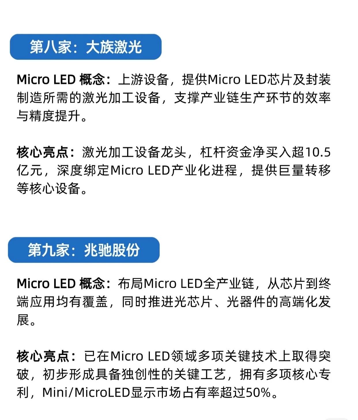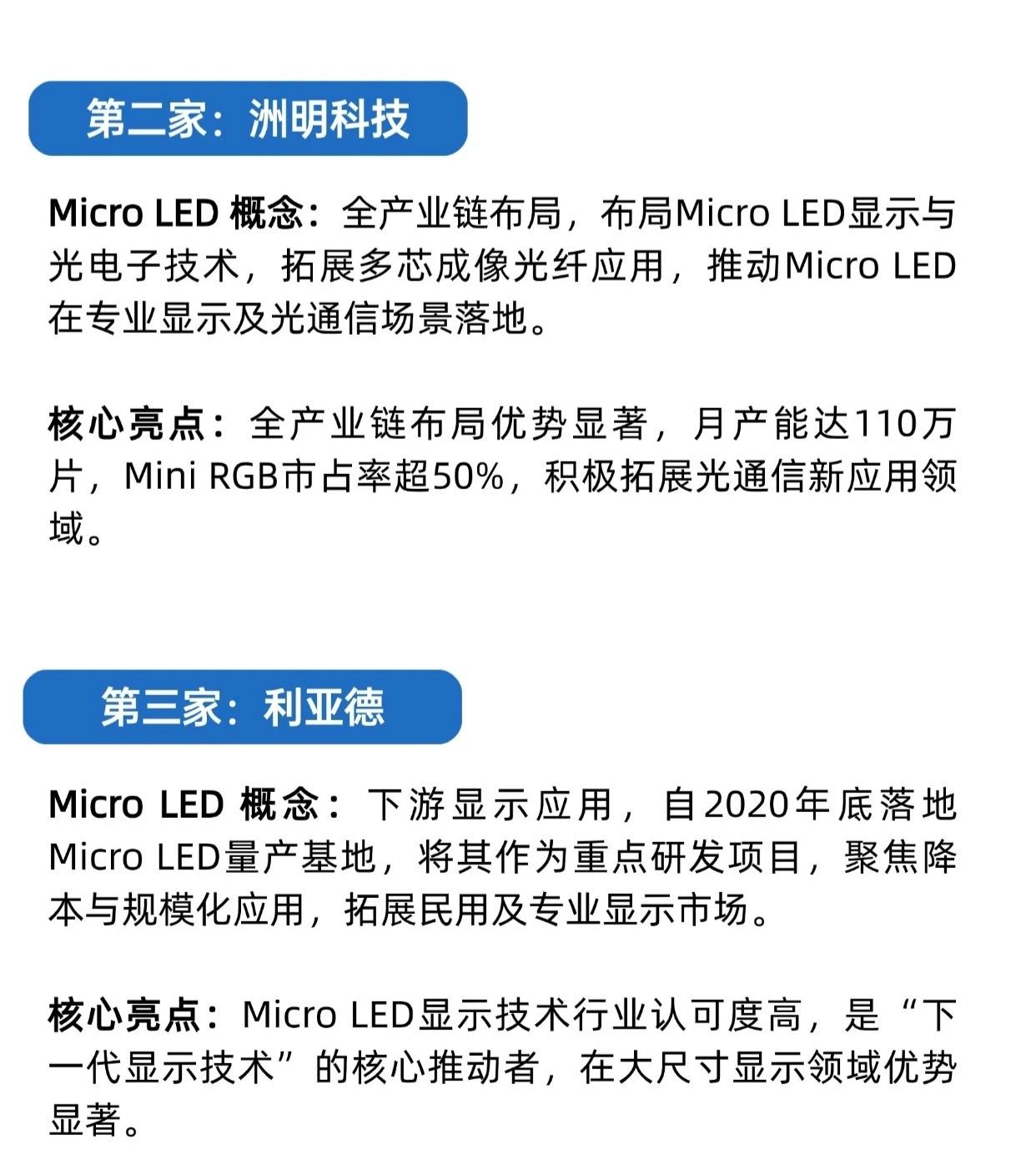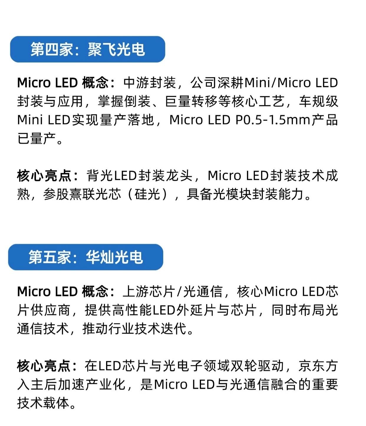 Micro LED产业链受生成式AI驱动数据中心高速传输需求激增(传统铜缆瓶颈)及微软MOSAIC光传输方案验证技术可行性催化,加速落地,以下是10大核心产业链企业总结: 序号 企业名称 产业链环节 核心定位与亮点 1 三安光电 上游芯片 国内Micro LED芯片龙头,技术壁垒高,全球竞争力强,是产业化核心支撑。 2 洲明科技 全产业链 布局显示与光电子,月产能110万片,Mini RGB市占率超50%,拓展光通信应用。 3 利亚德 下游显示应用 2020年底量产基地,聚焦降本与规模化,大尺寸显示领域优势显著。 4 聚飞光电 中游封装 深耕Mini/Micro LED封装,掌握倒装、巨量转移工艺,车规级Mini LED量产,参股熹联光芯。 5 华灿光电 上游芯片/光通信 核心芯片供应商,提供高性能LED外延片与芯片,京东方入主后加速产业化。 6 乾照光电 上游芯片 专注LED芯片与光电子器件,红黄光芯片领域优势,受益于Micro LED需求提升。 7 京东方A 下游面板制造 布局Micro LED面板及封装,推动大尺寸应用,拓展车载、消费电子,显示面板龙头。 8 大族激光 上游设备 提供Micro LED激光加工设备,支撑效率与精度,激光设备龙头,绑定产业化进程。 9 兆驰股份 全产业链 覆盖芯片到终端,推进光芯片高端化,多项关键技术突破,Mini/MicroLED市占率超50%。