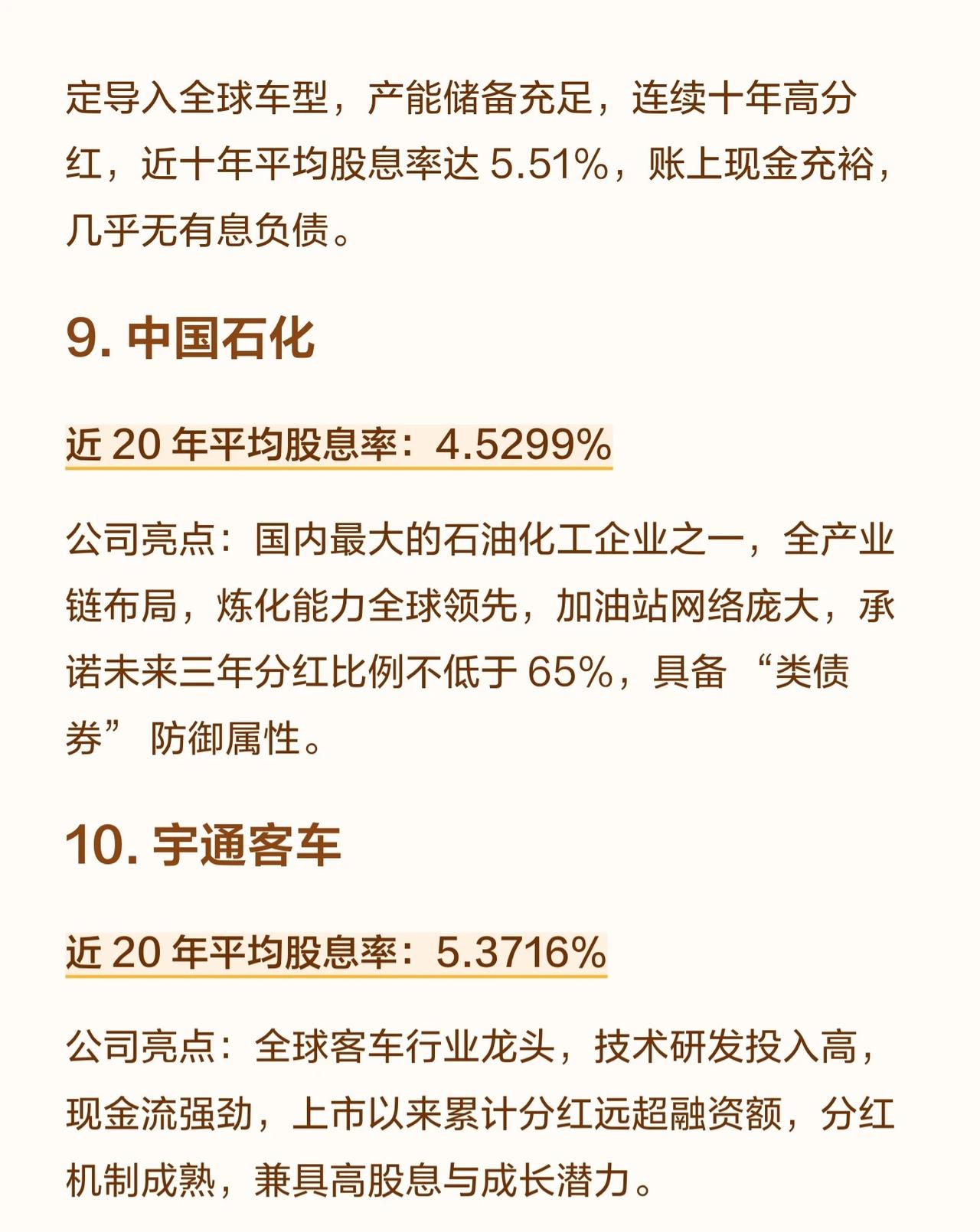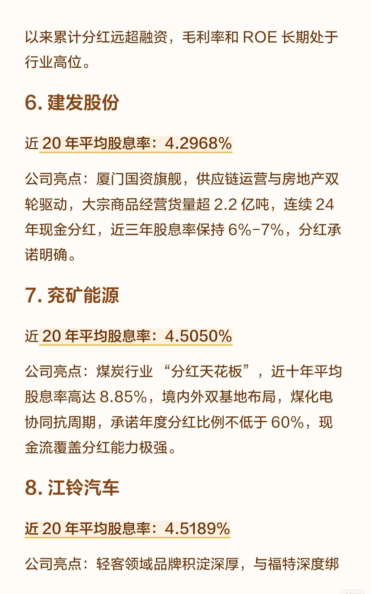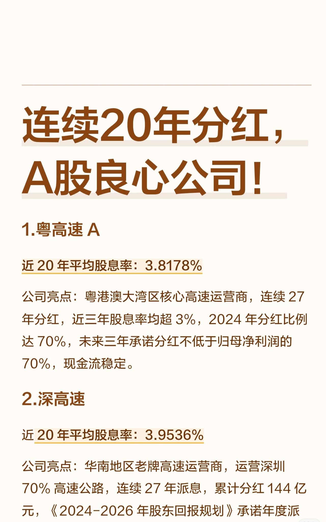 A股连续20年分红的10家“良心公司”,这些公司均具备长期稳定分红、现金流充裕的特点,且多数对未来分红比例做出承诺。它们覆盖高速、制造、能源、汽车、石化等多个行业,平均股息率在3.8%至5.5%之间,部分公司近十年平均股息率更高,兼具防御性与成长性,适合追求稳定收益的投资者。 10家A股“高股息良心股”,连续20年分红,现金流稳,未来分红承诺明确,股息率3.8%-5.5%,覆盖高速、能源、制造等行业,适合稳健型投资者。